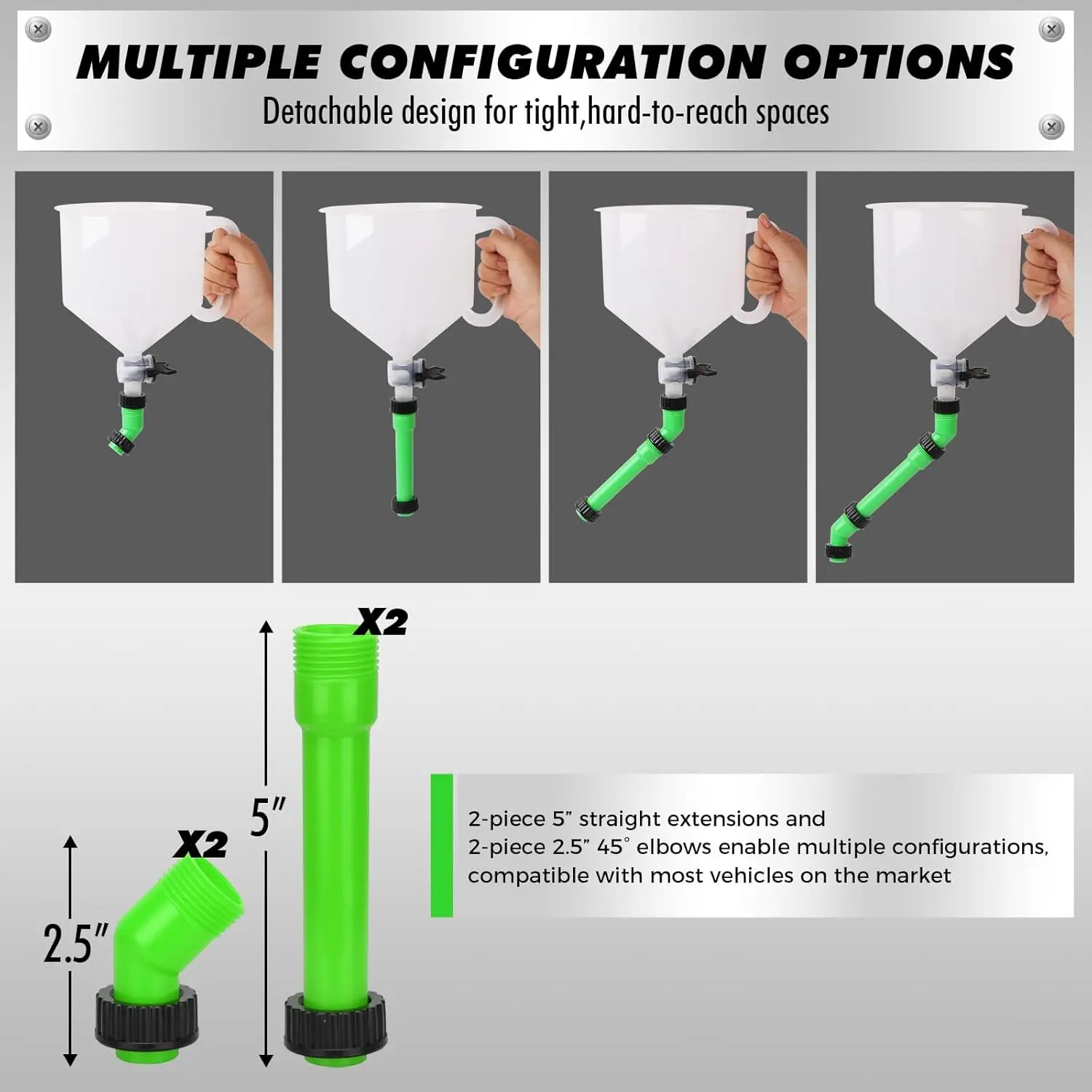 ·EXTENDED REACH ACCESS - Comes with a 5-inch straight extension and 2.5-inch angled elbows to reach recessed or awkward fill points, making it easier to work in tight engine compartments