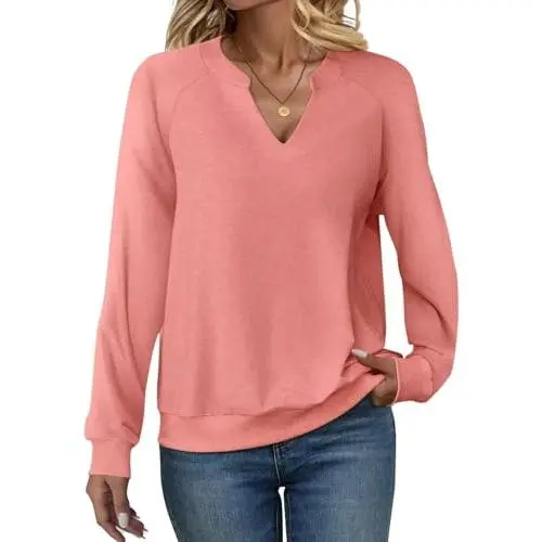 Women's Casual Long Sleeve V-Neck Sweatshirt - Cute Loose Fit Lightweight Pullover Top Comfortable Soft Fabric Perfect for Everyday Wear Fall Winter Fashion Style Lounge Wear Essential Clothing