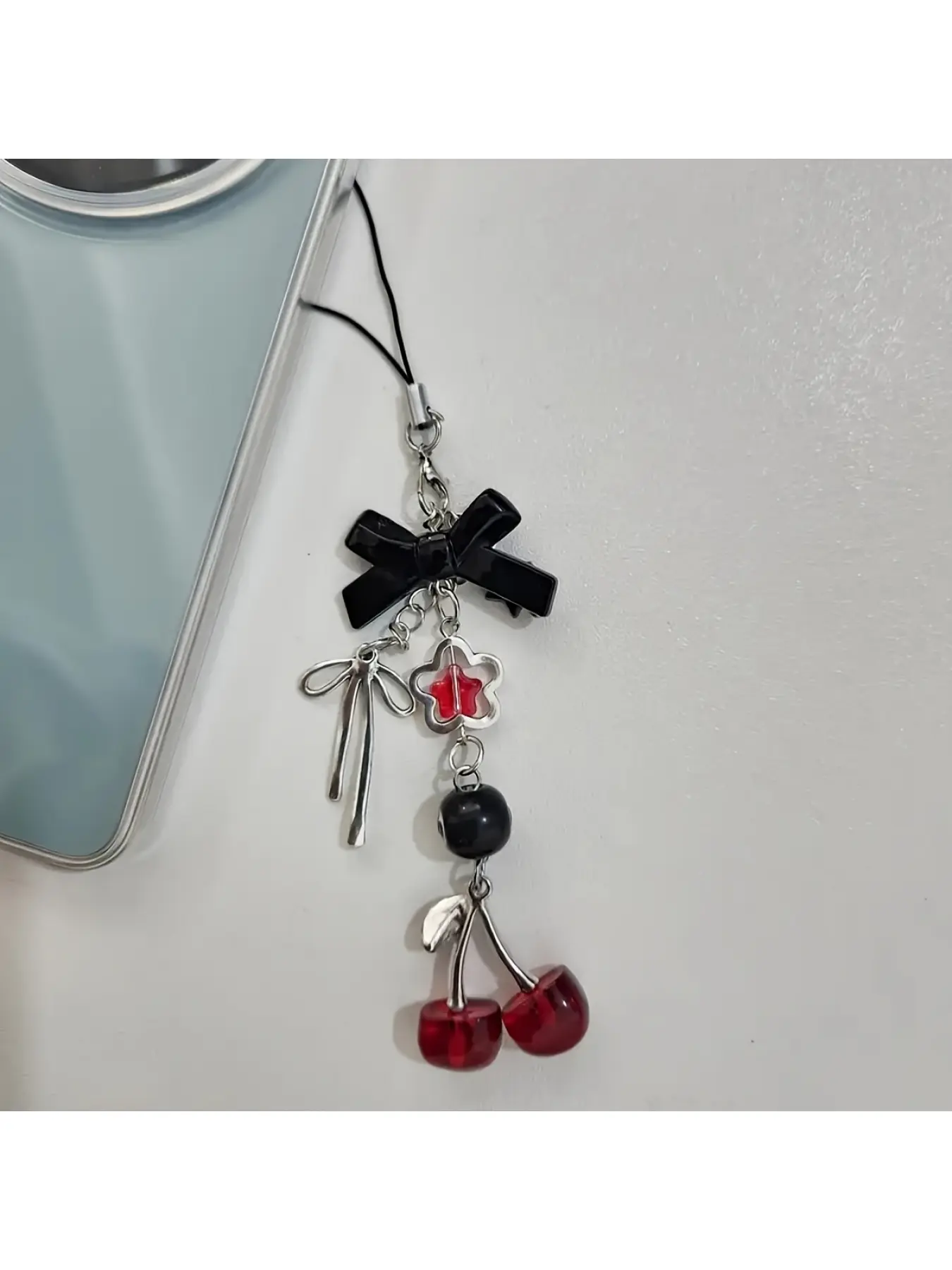 A Y2K Red Cherry Phone Strap with a Bow - Features Colorful Resin Decorative Pendants, Suitable for Phone Straps, Headphone Charms, And Other Cherry-Themed Items