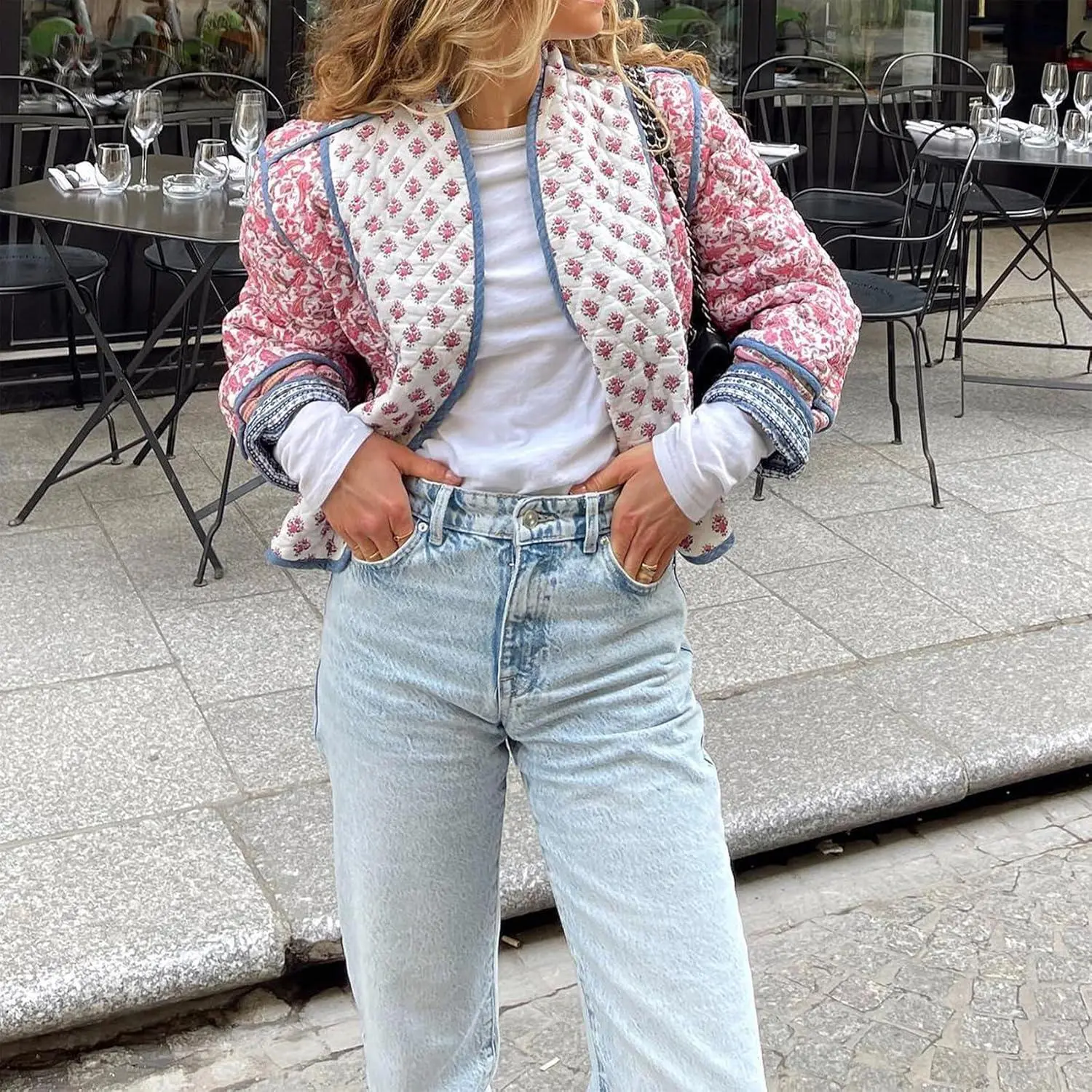 Women's Lightweight Cropped Puffer Jacket with Floral Print - Open Front Quilted Coat Warm Winter Outwear Perfect for Casual Daily Wear Fashion Style Comfortable Breathable Design