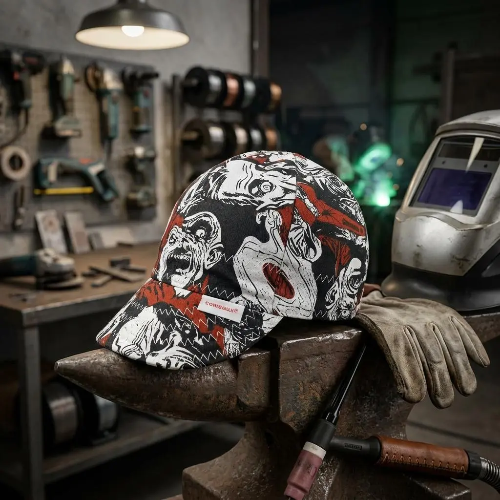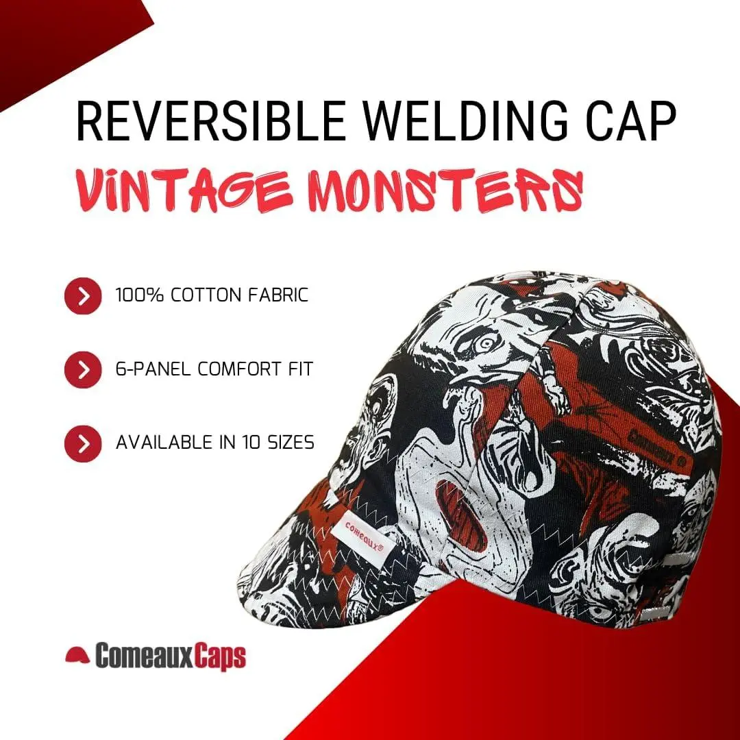 Vintage Monsters Print Reversible Welding Cap - 100% Cotton Durable Work Hat for Men & Women, Adjustable Size, Breathable Fabric, Perfect for Construction, Welding, Outdoor Work, DIY Projects, and Everyday Use as a Comfortable and Stylish Headwear