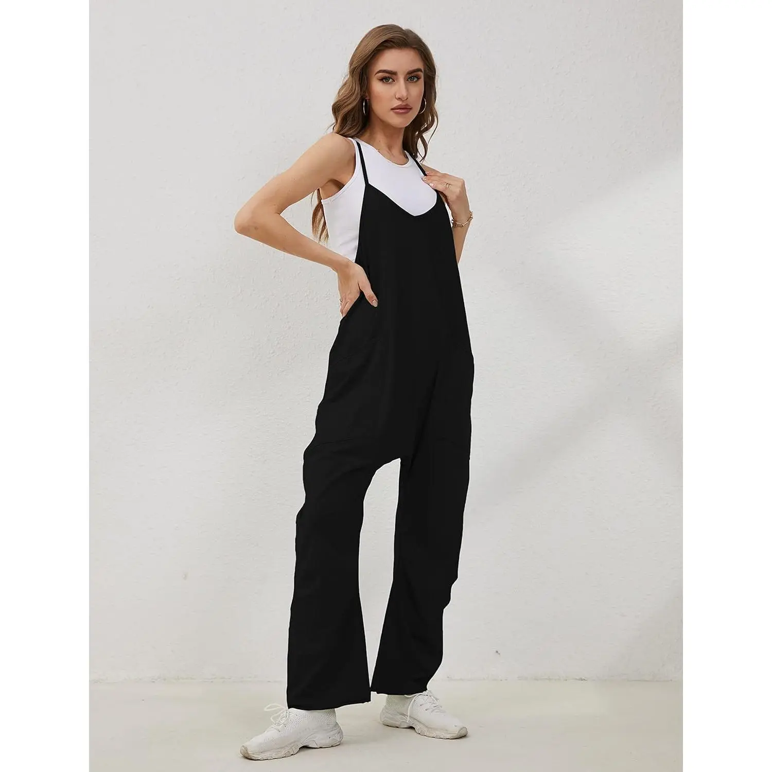 Women's Casual Jumpsuit Romper - V Neck Sleeveless Harem Overalls with Adjustable Straps and Pockets, Stretchy Comfortable Fabric Perfect for Daily Wear, Summer Outfits, Beach Vacation, Shopping, and Casual Parties