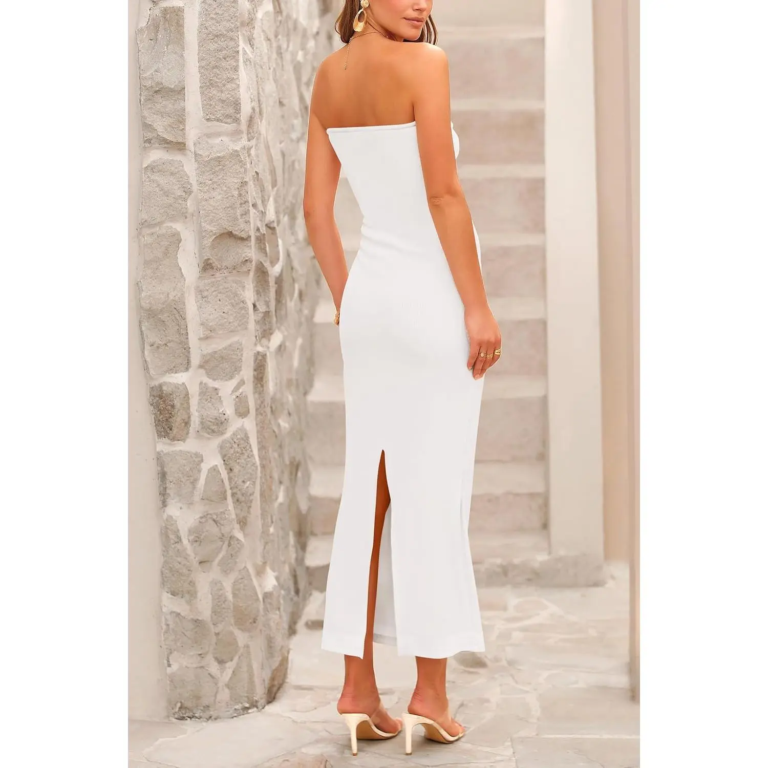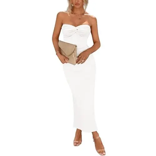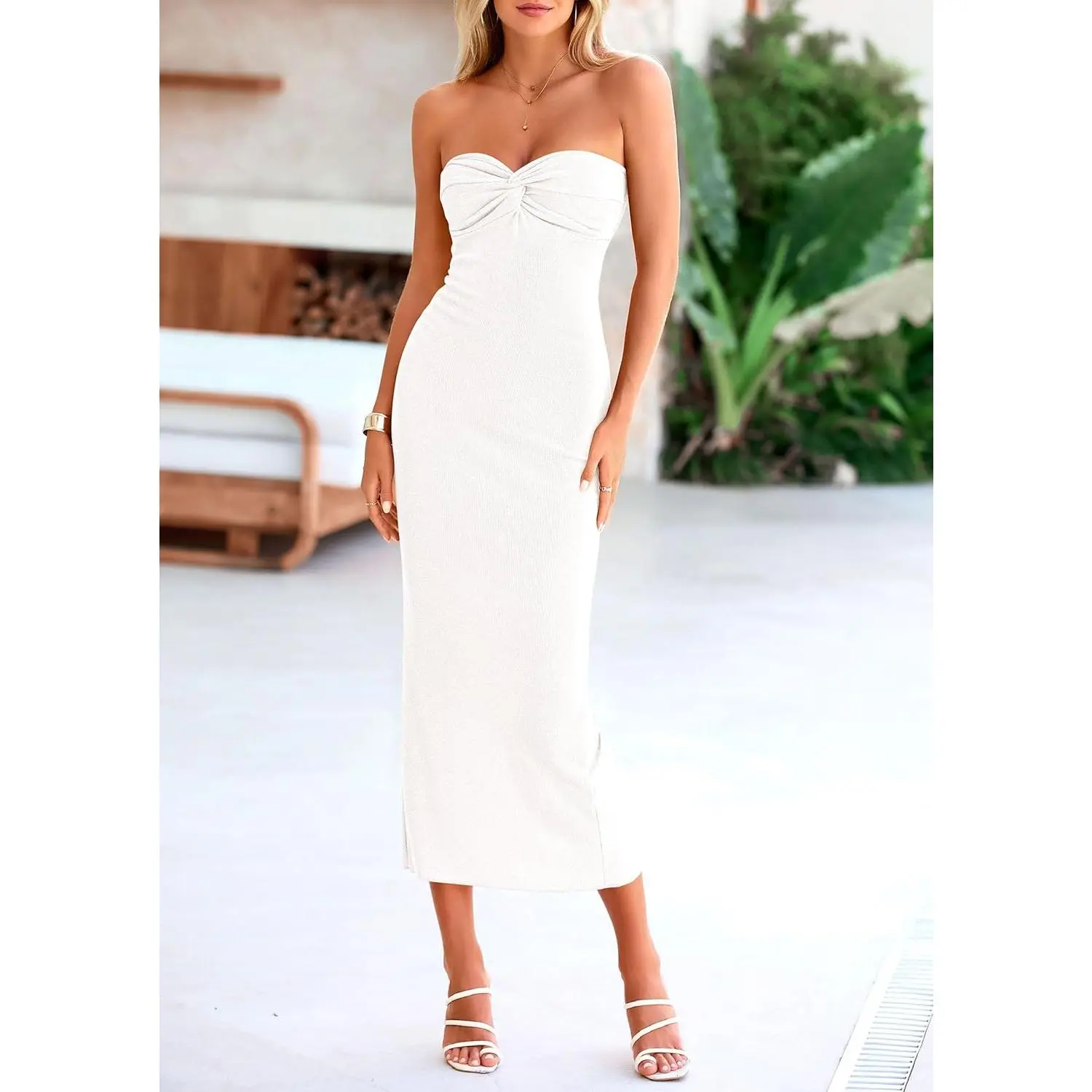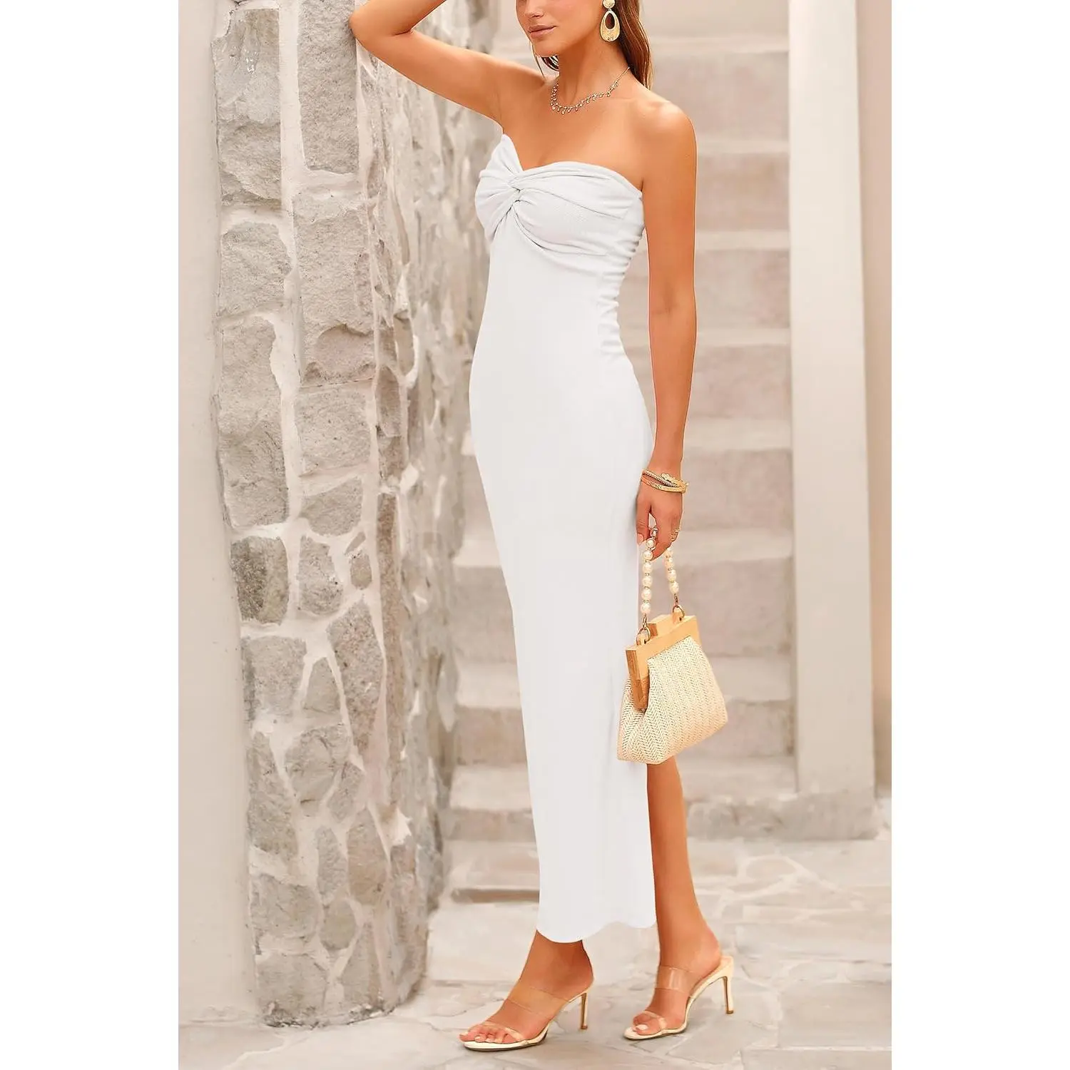 Women's 2026 Summer Bodycon Maxi Dress - Strapless Tube Twist Knot Front Ribbed Knit Slit Cocktail Party Dress Elegant Sexy Figure-Hugging Long Evening Gown Perfect for Night Out Club Formal Occasions Fashionable Ladies Clothing