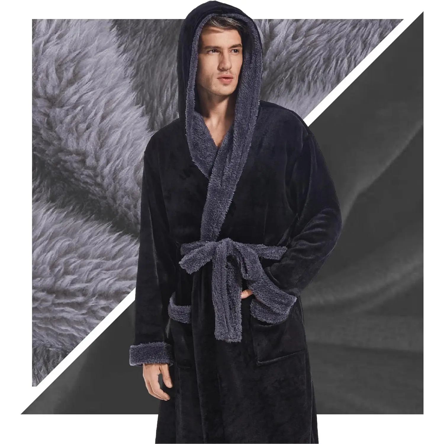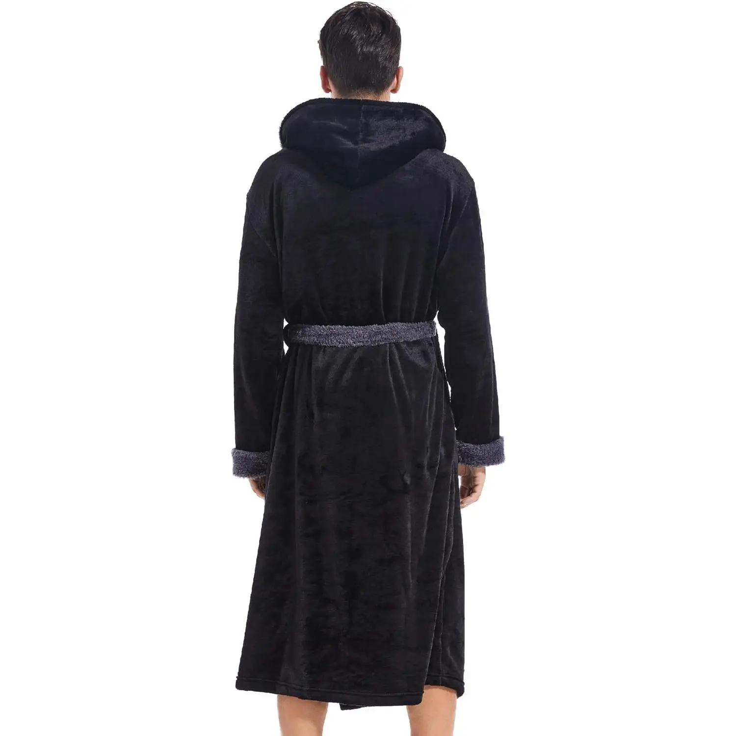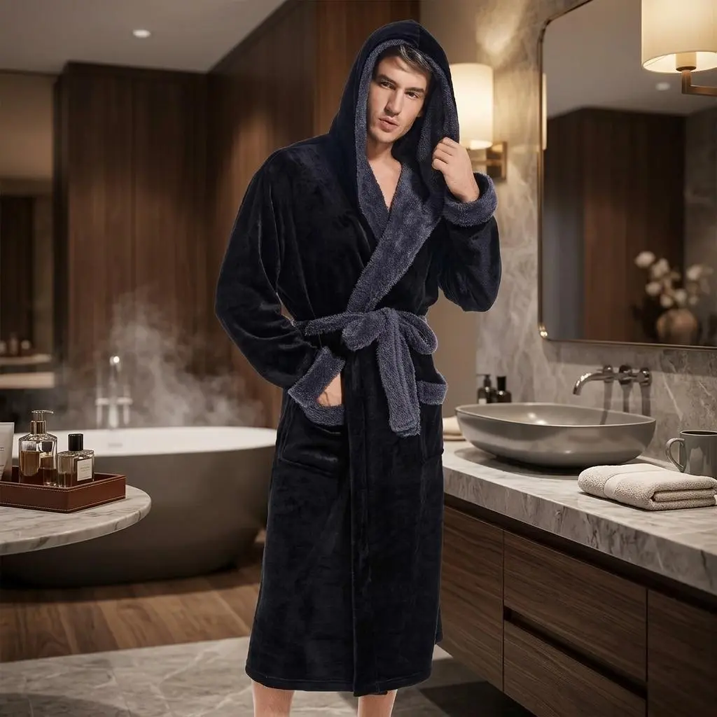 Men's Plush Long Hooded Bathrobe - Cozy Warm Fuzzy Spa Robe with Pockets, Soft Comfortable Loungewear for Home Relaxation After Shower Bath, Perfect Gift for Him