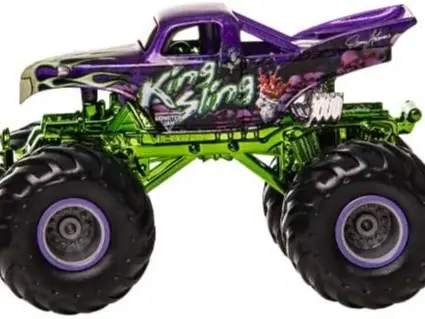 ·Limited Edition Collectible – Only 5,000 of these special edition trucks were made, making it a rare and valuable find for collectors. Dennis Anderson’s King Sling – Modeled after the legendary 1941 Willys mega truck with the fan-voted purple paint scheme. Authentic Monster Jam Design – Features realistic graphics, die-cast body, and bright green chassis, replicating the real King Sling truck. Durable & Display-Ready – Built tough with working suspension and packaged in official collector-style blister packaging.