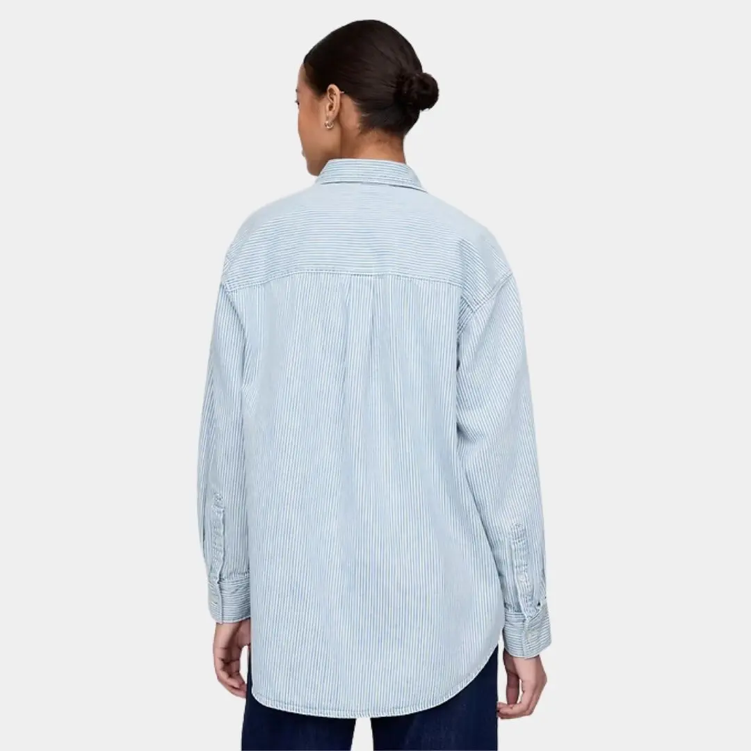 Our oversized shirt, a timeless classic, is perfect for everyday wear. It features a soft cotton denim material, point collar, and button front. Long sleeves with button cuffs and a front patch pocket add to its charm. Allover stripes give it a vintage look. This shirt is part of our Washwell program, using 20% less water. We've saved over a billion liters since 2016.
