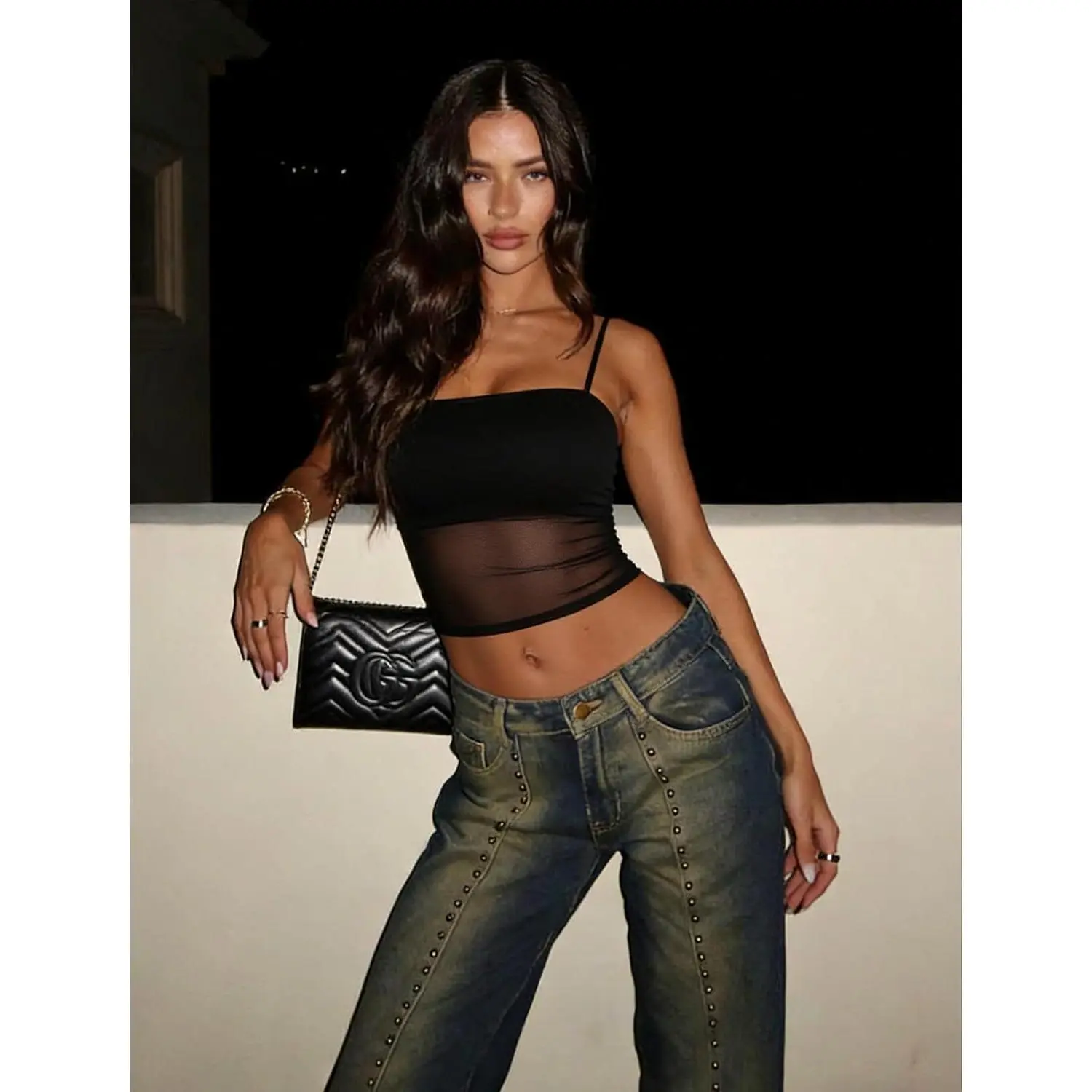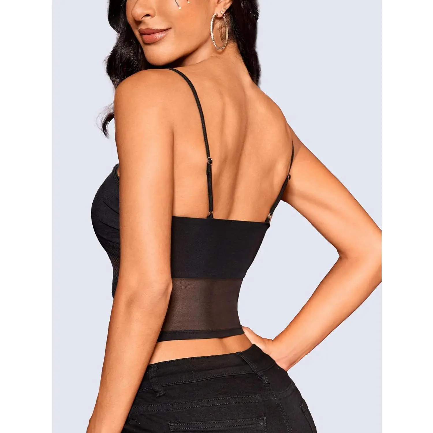 Women's Spaghetti Strap Mesh Tank Top Tube Slim Y2K Camisole Ultra-Cropped Bralette - Lightweight Breathable Stretchy Lace Lingerie Top Perfect for Layering Casual Wear Summer Outfit Fashion Style (1 & 2 Pcs)