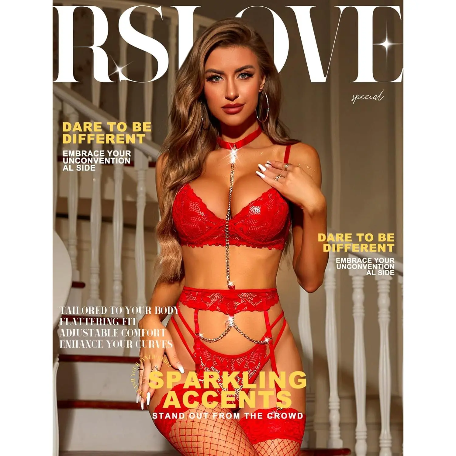Women's Sexy Lace Lingerie Set with Garter Belt - 3 Piece High Waist Push Up Bra and Panty Exotic Sleepwear Comfortable Elegant Underwear for Special Occasions