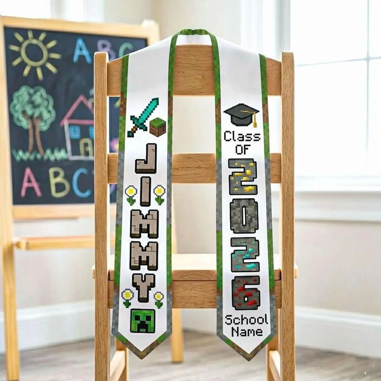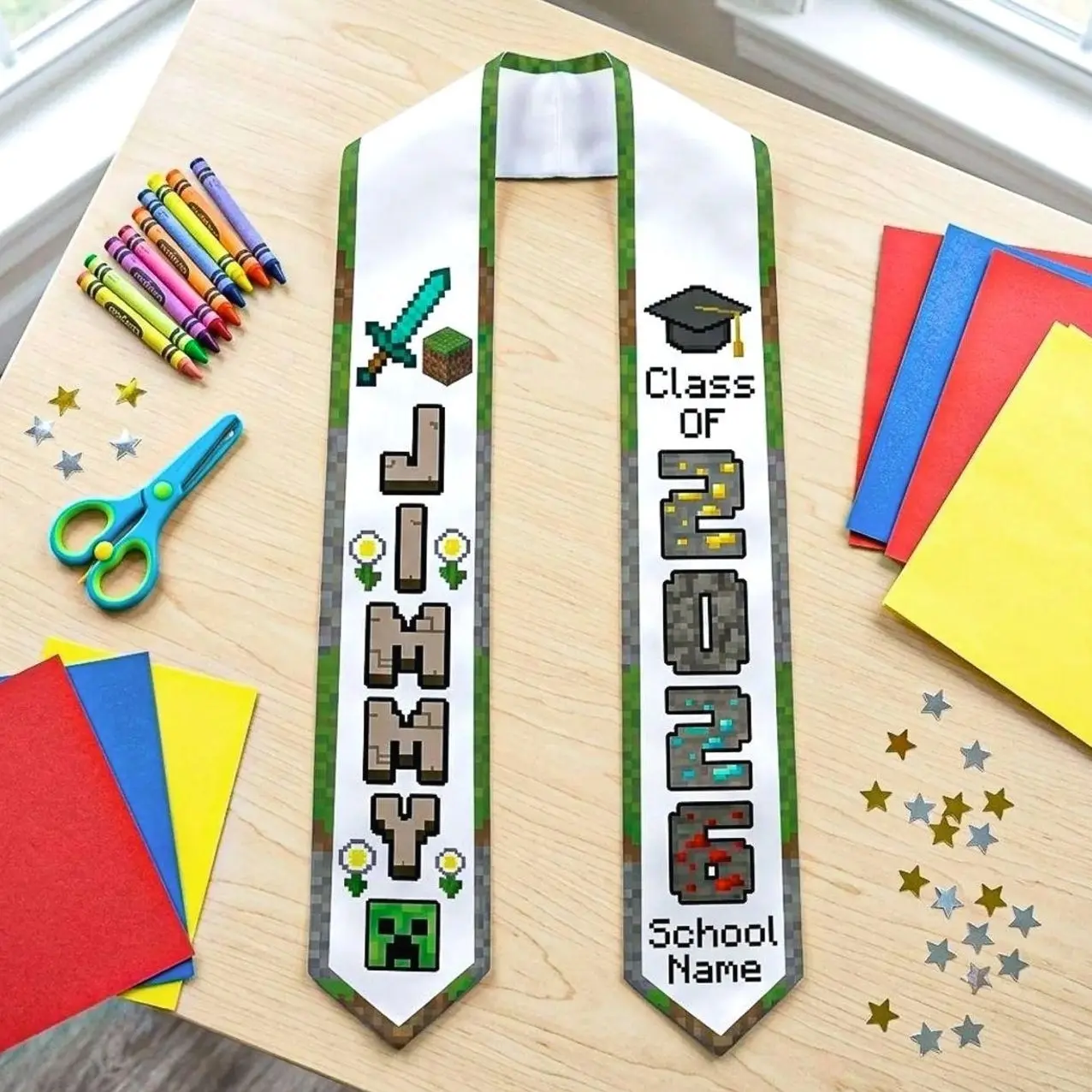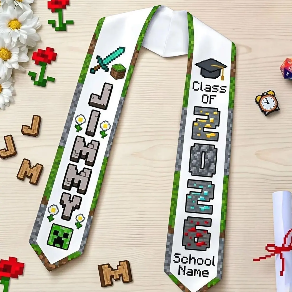 Personalized Pixel Block Style Graduation Stole Class of 2026, Custom Name Pixel Block Sash, Gamer Grad Gift, Kids Graduation Sash Stole