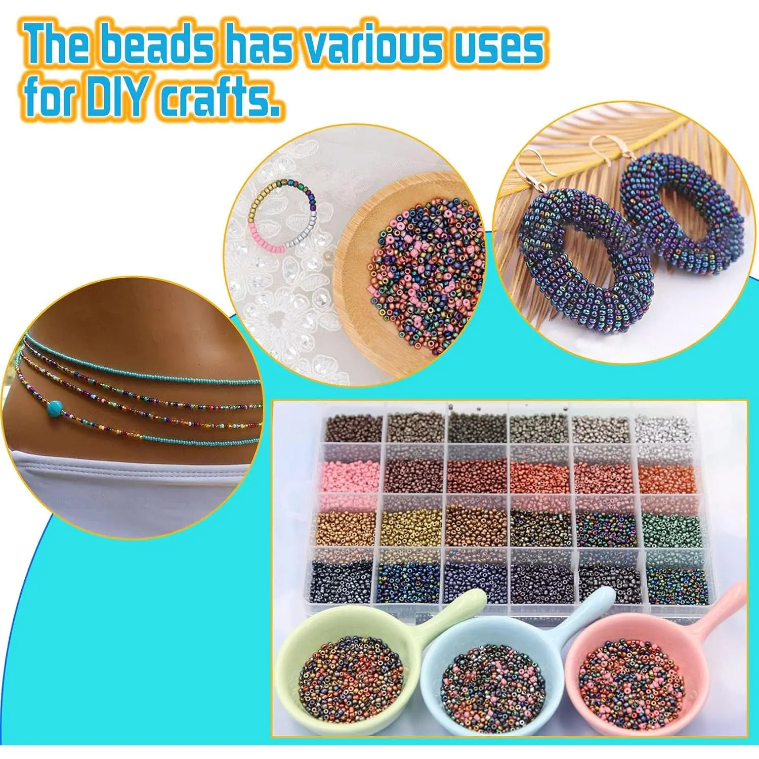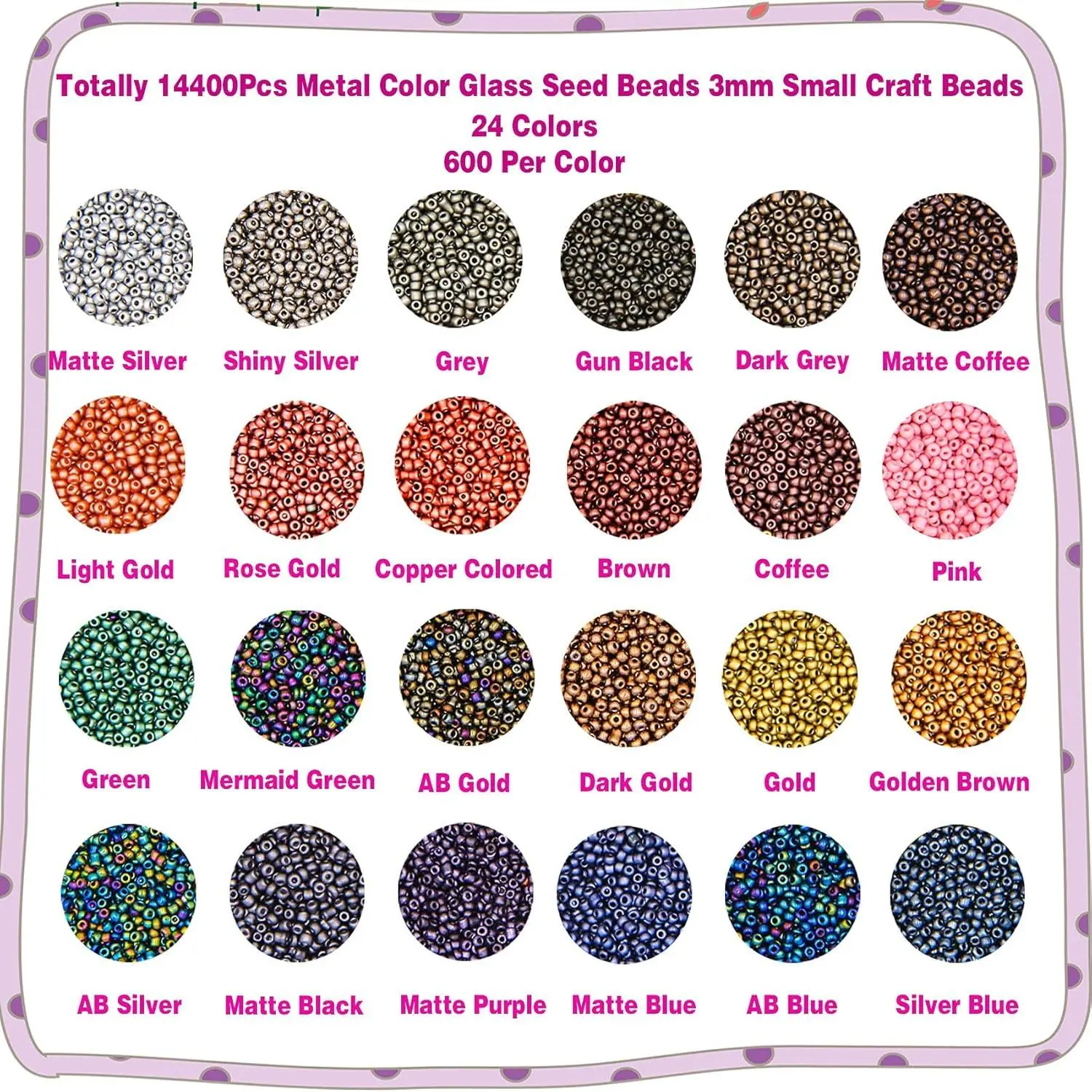 EuTengHao 8/0 Glass Seed Beads Kit, 3mm Metal Color Waist Beads, 24Colors Small Pony Beads with String for Bracelet Necklace Earring Jewelry Making (14405PCS, 600 Per Color)
