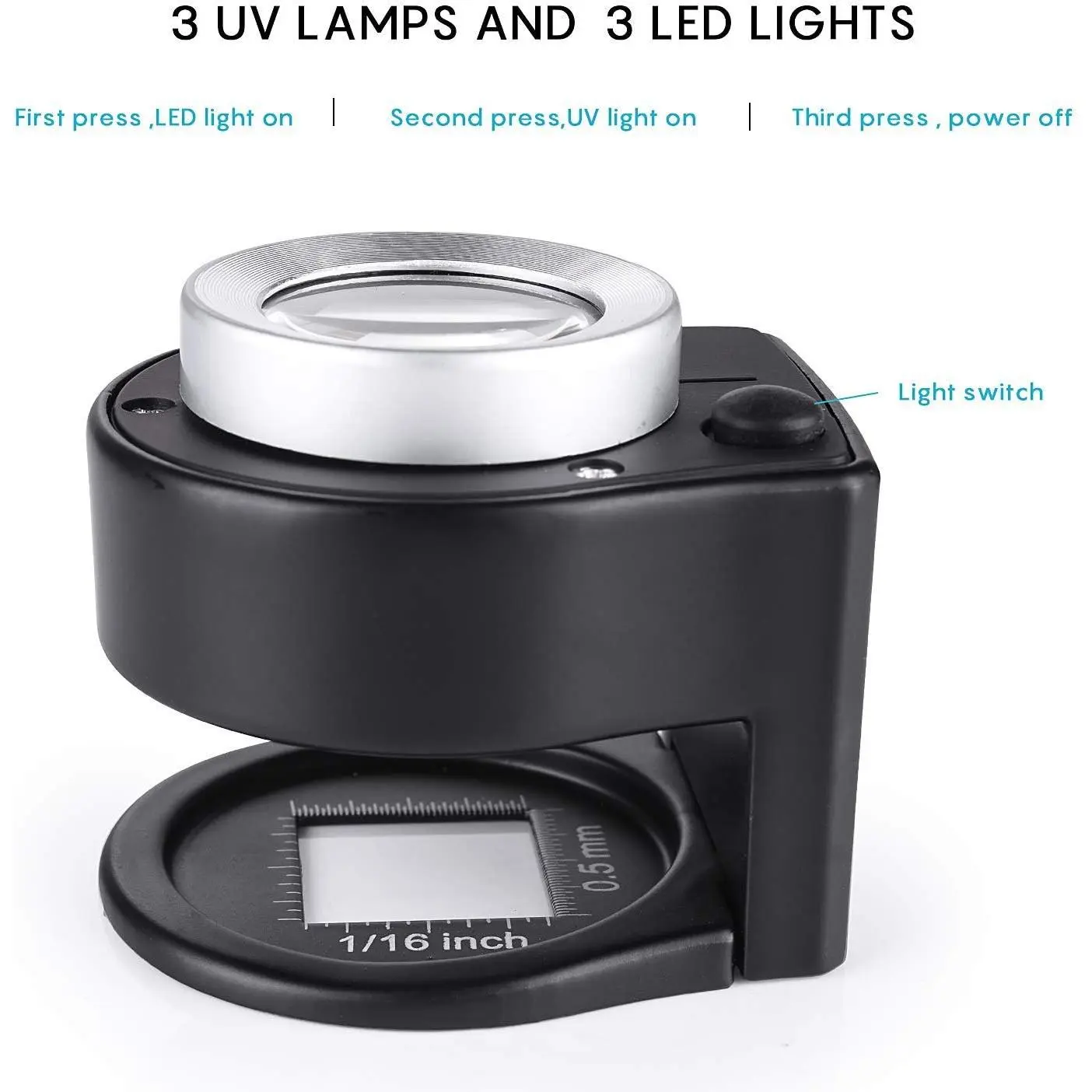 30X Loupe Magnifier with 6 Light, Desktop Portable Metal Magnifier Folding Scale Sewing Magnifying Glass for Textile Optical Jewelry Tool Coins Currency (Black)