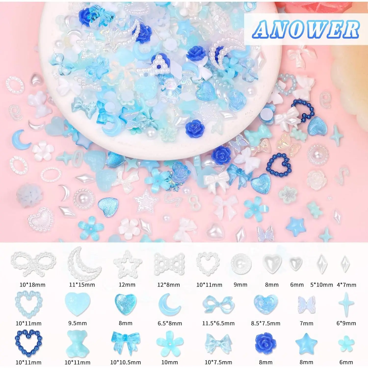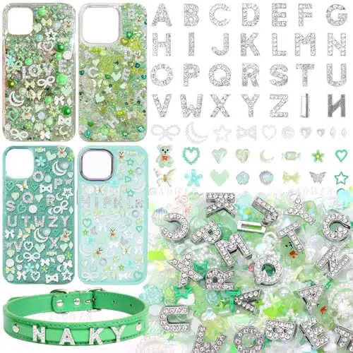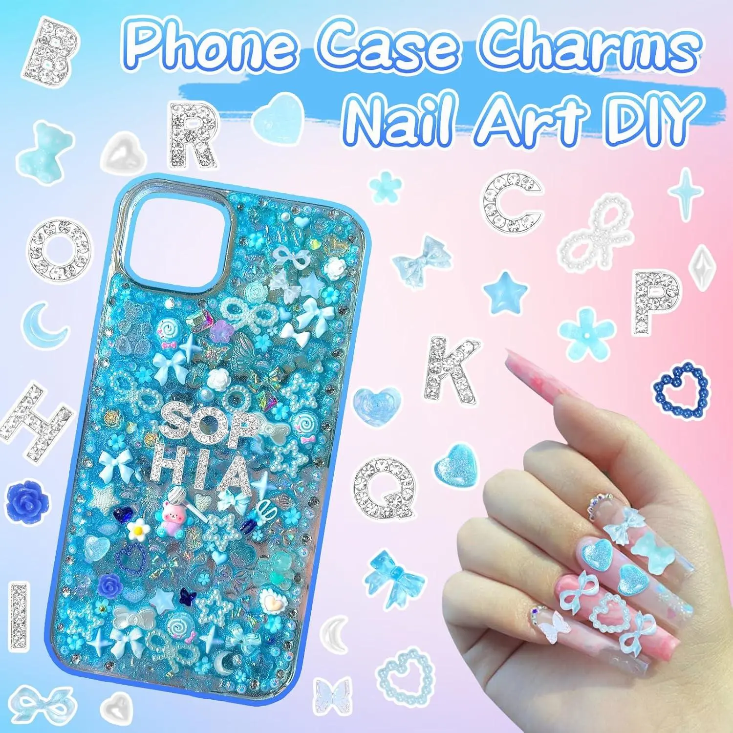 330 Pcs Blue Junk Phone Case Charms 26 Pcs A-Z Rhinestone Alphabet Letter Charms, Mix Flower Bow Heart Pearls Flatback Resin Charms Letter Junk Cases Kit for DIY Crafts