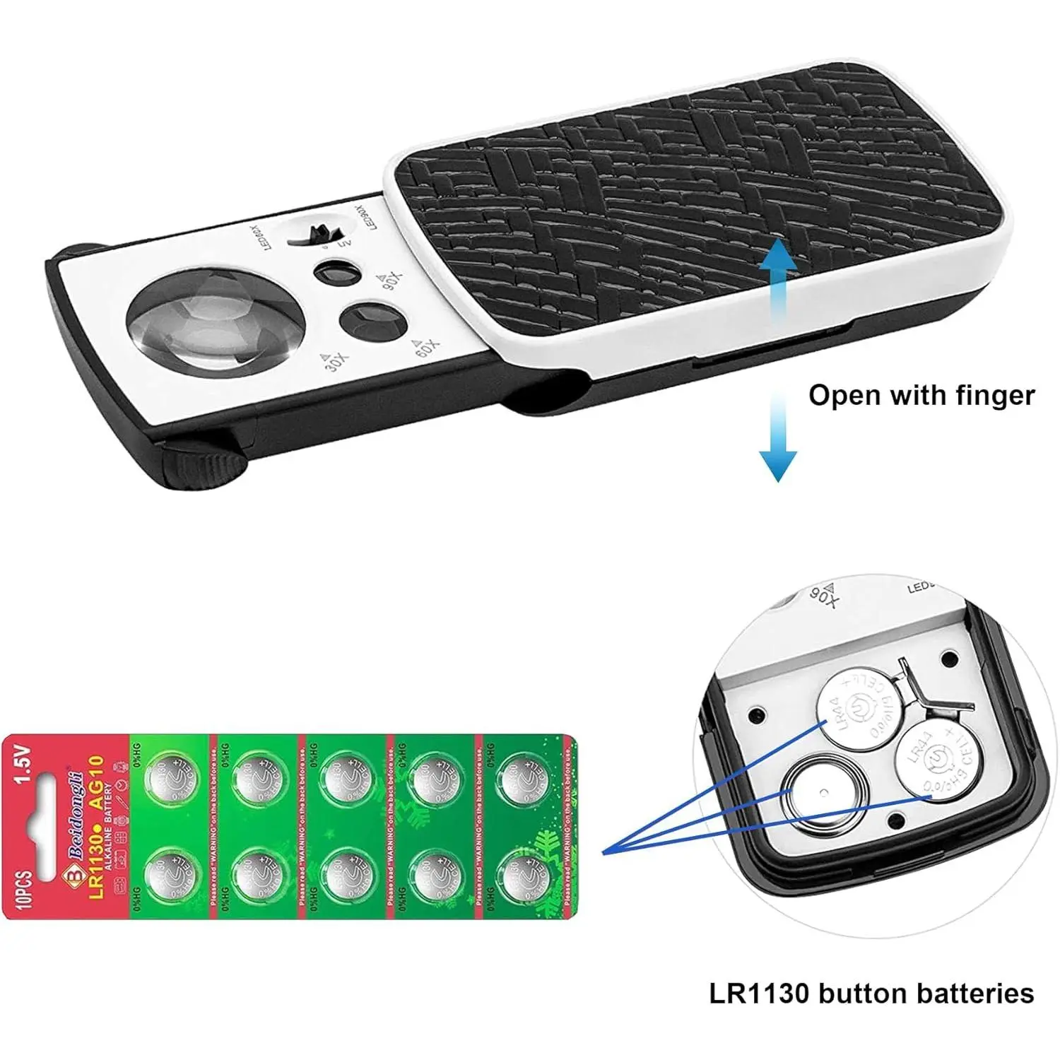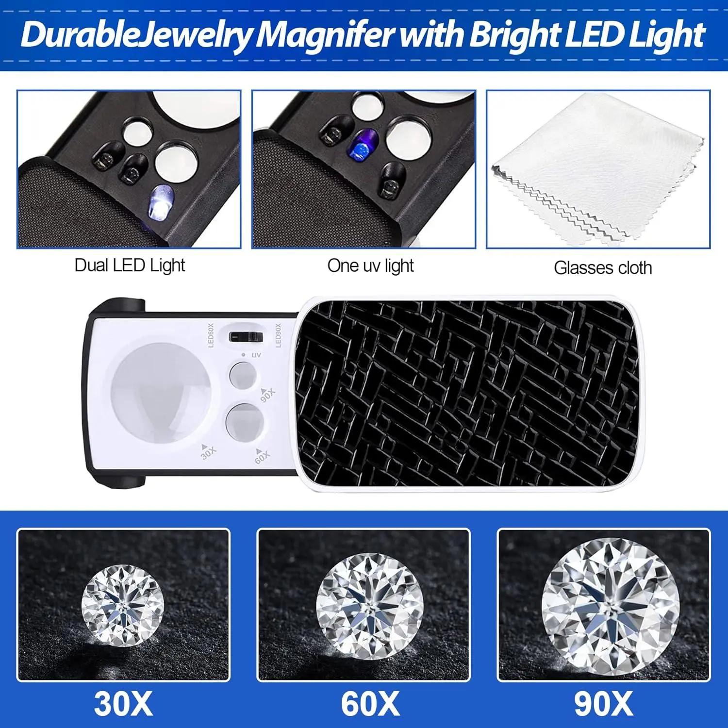 HMKIS Jewelers Loupe, 2 Pack Magnifying Glass with Light, 30X 60X 90X Jewelers Loop Magnification with 10 Backup Batteries for Coin, Diamonds, Gems, Jewelry, Stamps Close Work