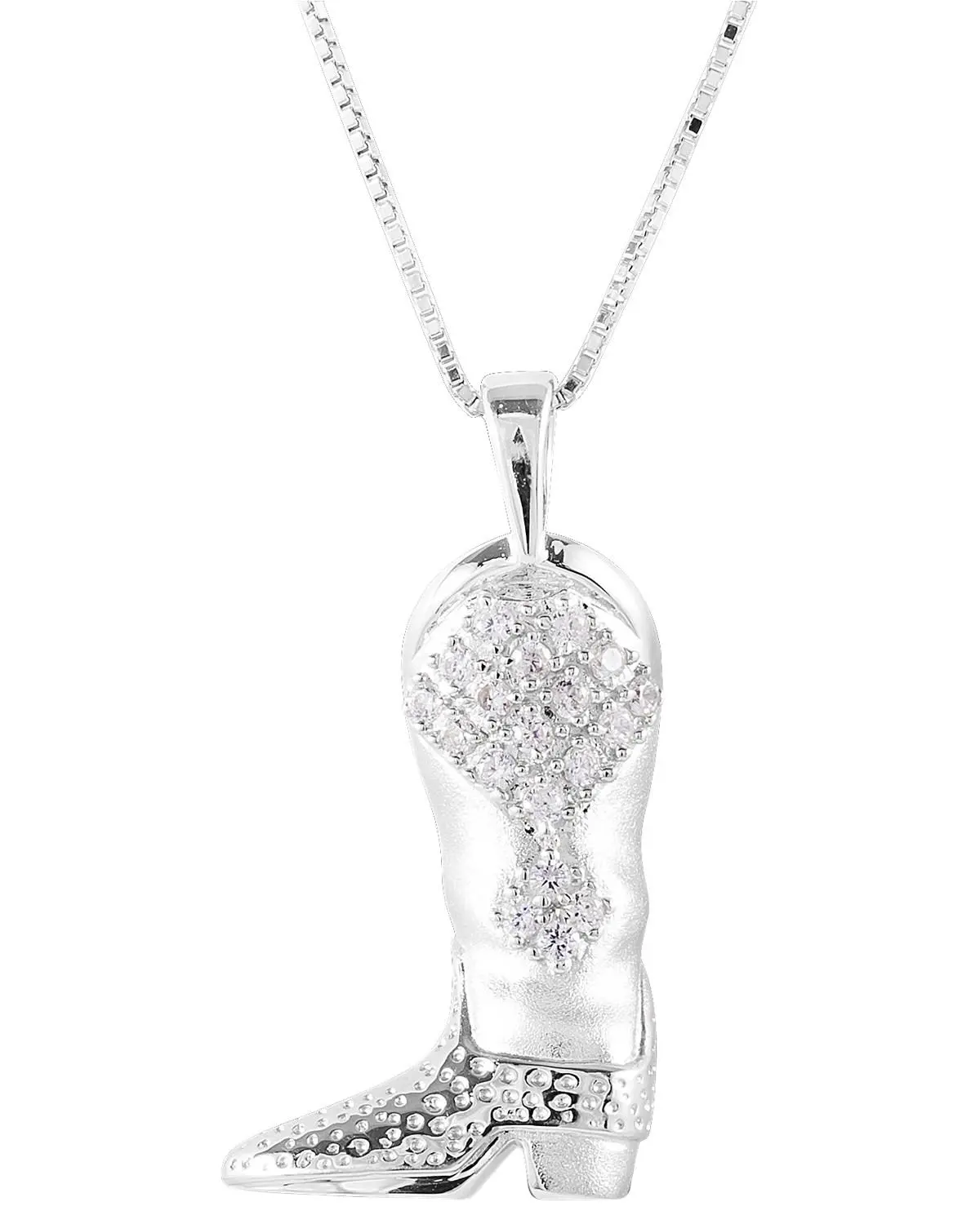 Sterling silver / 14K gold. Lobster clap closure. Rendered cowboy boot pendant with clear CZ stones. Adjustable 16-18" chain.