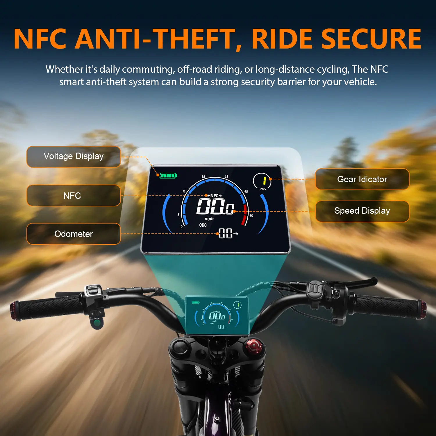 ·LCD Smart Dashboard: Real-time display of speed, battery level, mileage, gear, and power mode.