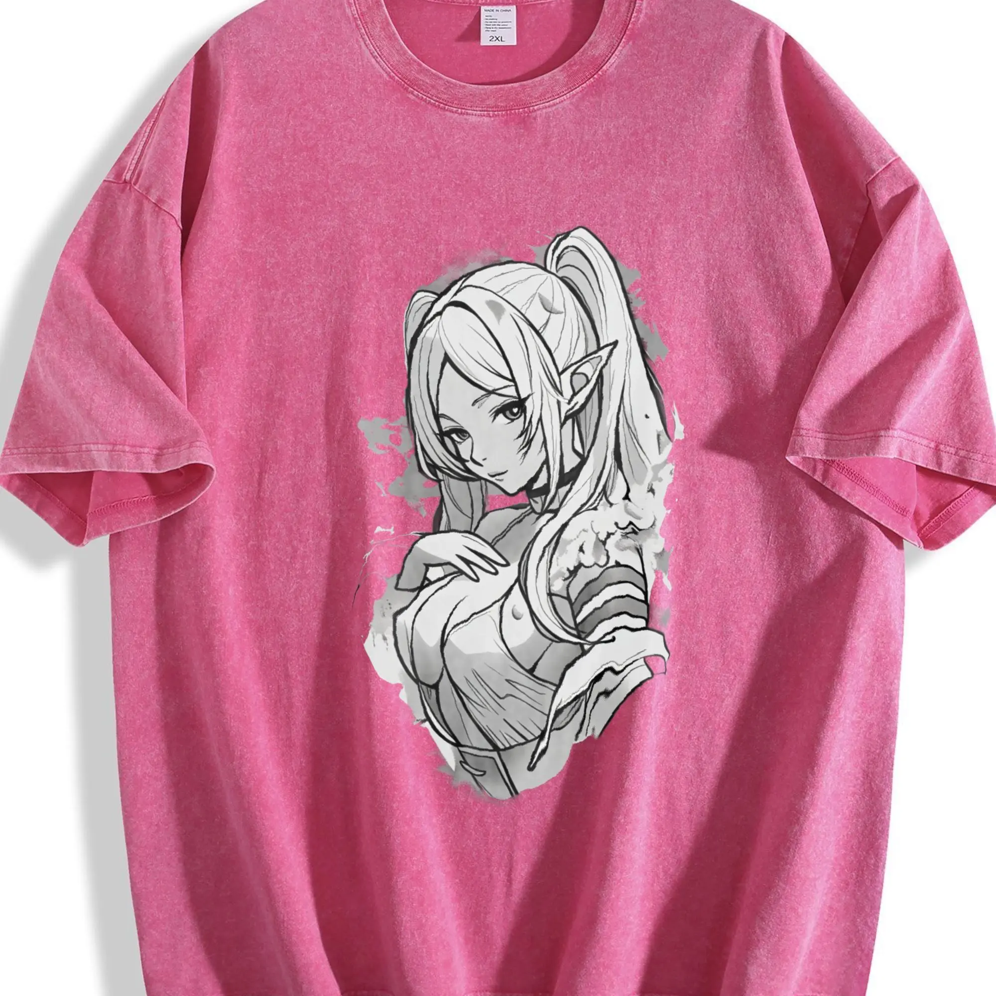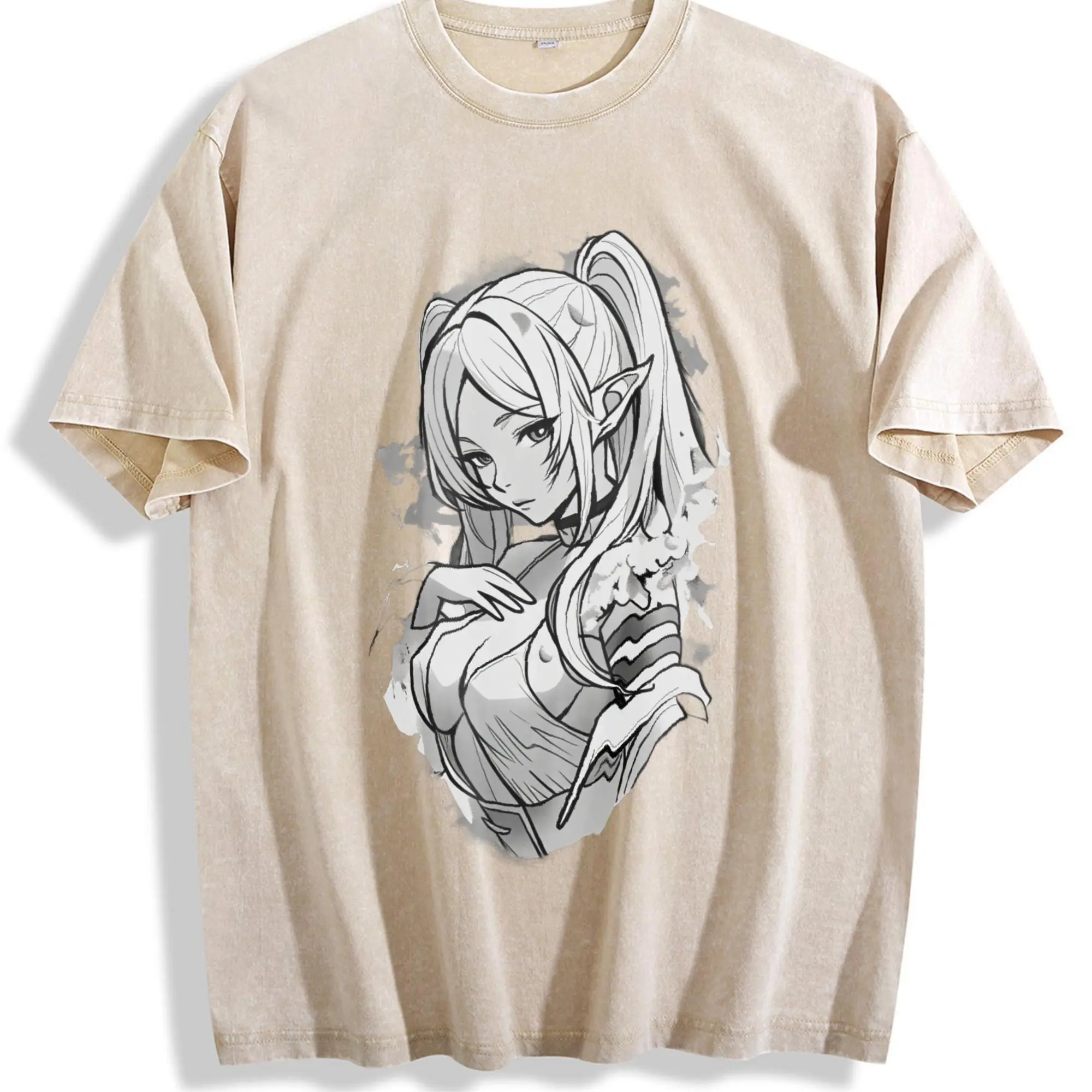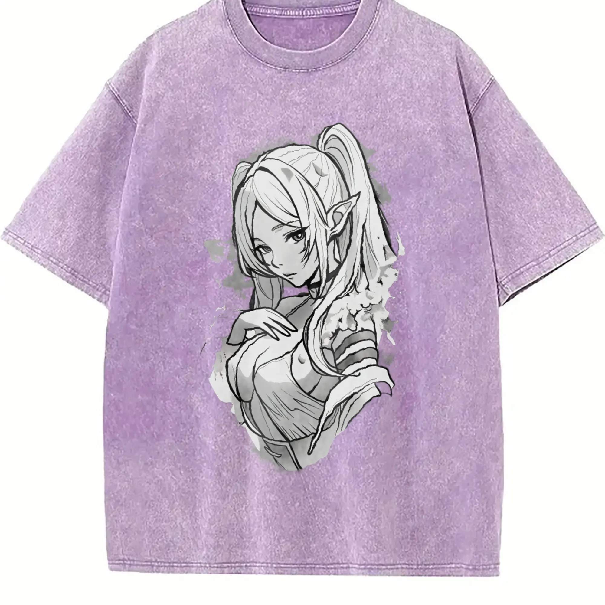 5. Frieren × Fern Frieren: Beyond Journey's End Anime Double Printed Vintage Washed Tee Unisex Oversize Anime Manga Washed Heavyweight Cotton T-shirt boyfriend tees wicked merchandise