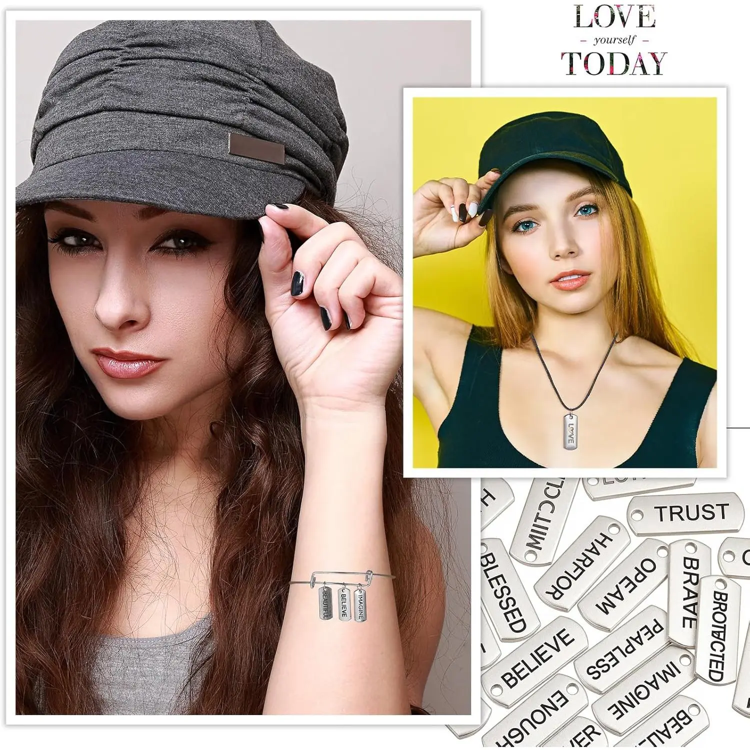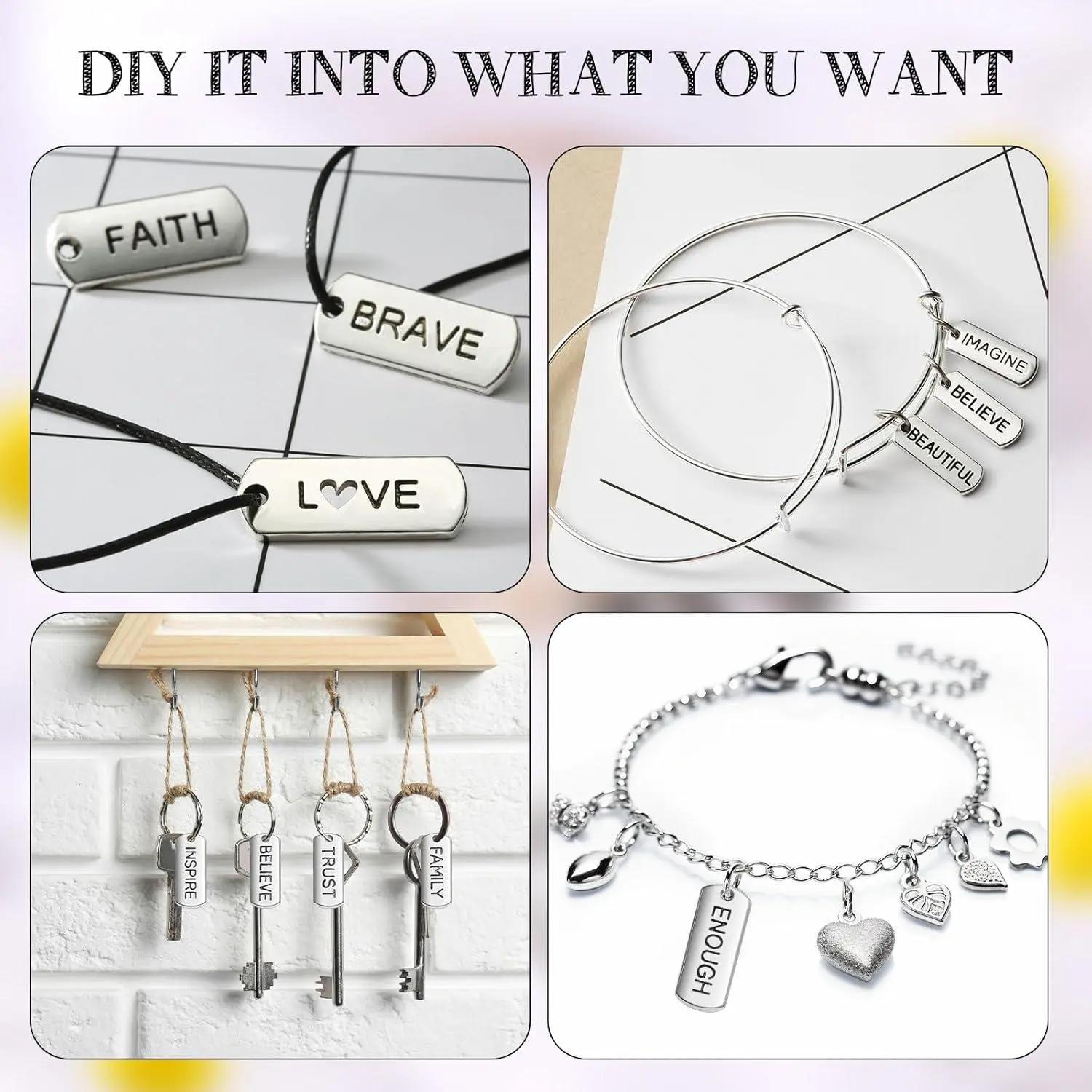 Hicarer Word Charms Pendants Engraved Motivational Charms Pendants Jewelry Making Accessories for DIY Necklaces, Bracelets, Key Chains(Silver,80 Pcs)