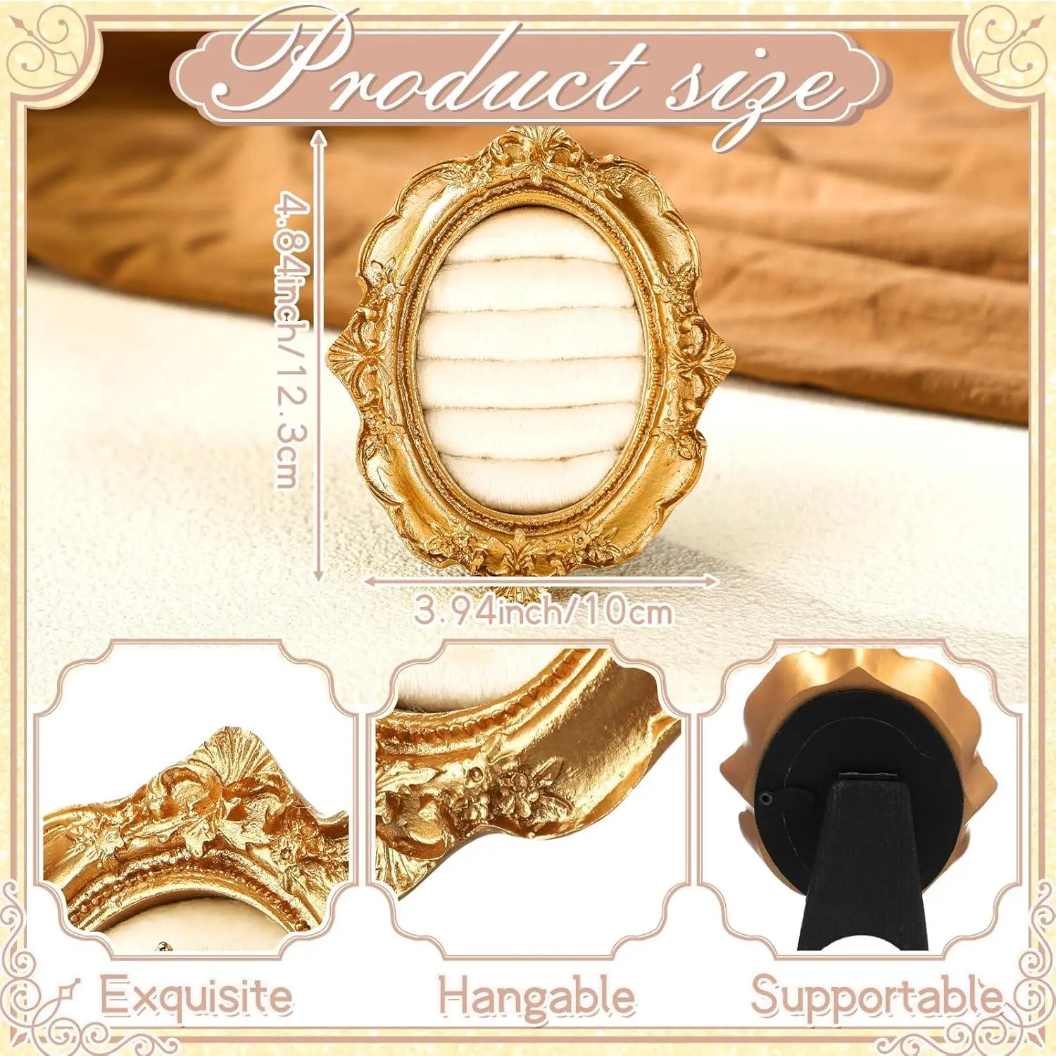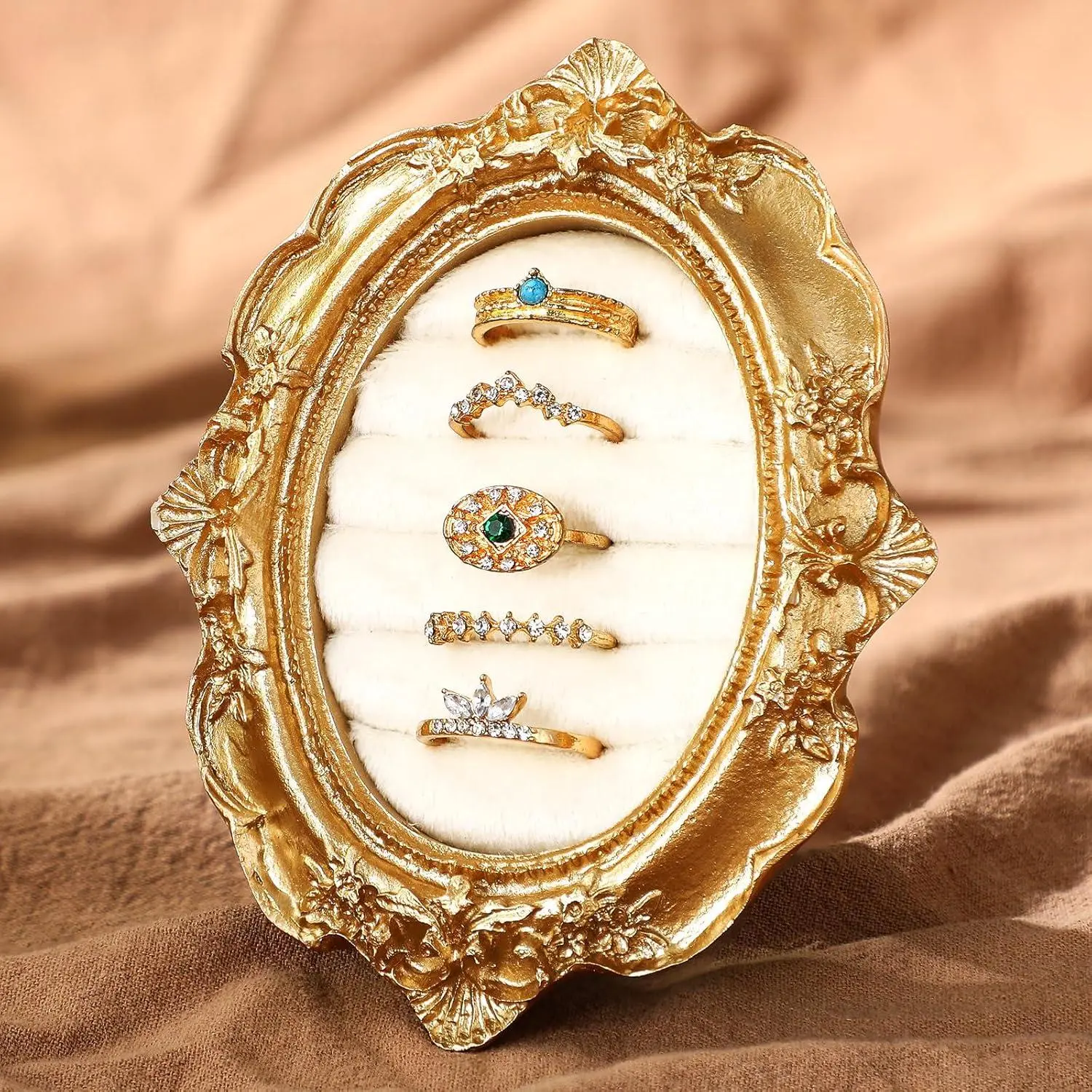 Liliaafar Vintage Ring Holder Oval Gold Ring Wedding Display Suede Jewelry Box Stand Frame Earring Tray Anniversary Engagement Baroque Organizer Photograph Prop for Women Birthday Christmas Gift