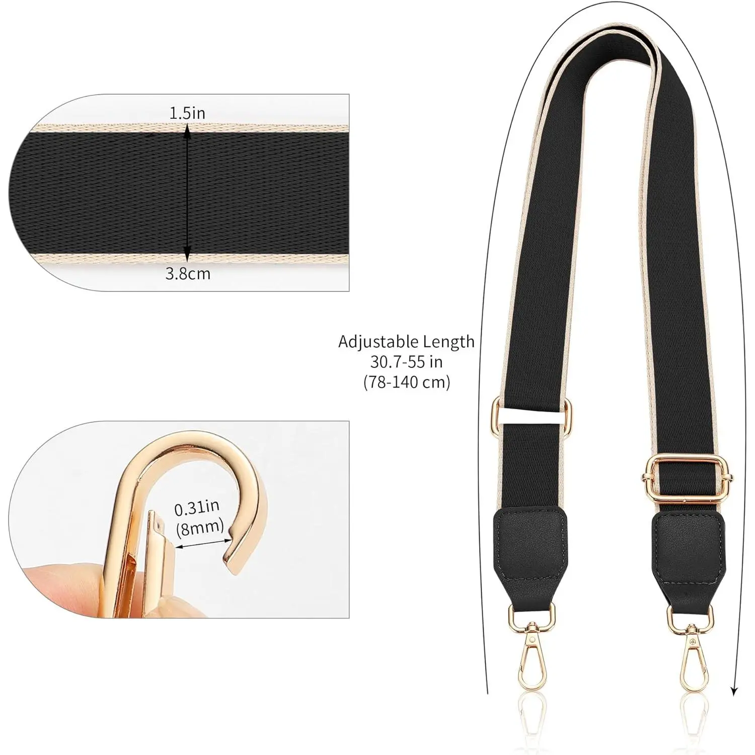 Hamdecro Purse Straps Replacement Crossbody, Universal Wide Shoulder Strap for Bags Adjustable Straps for Handbags, Gold Buckle - Black