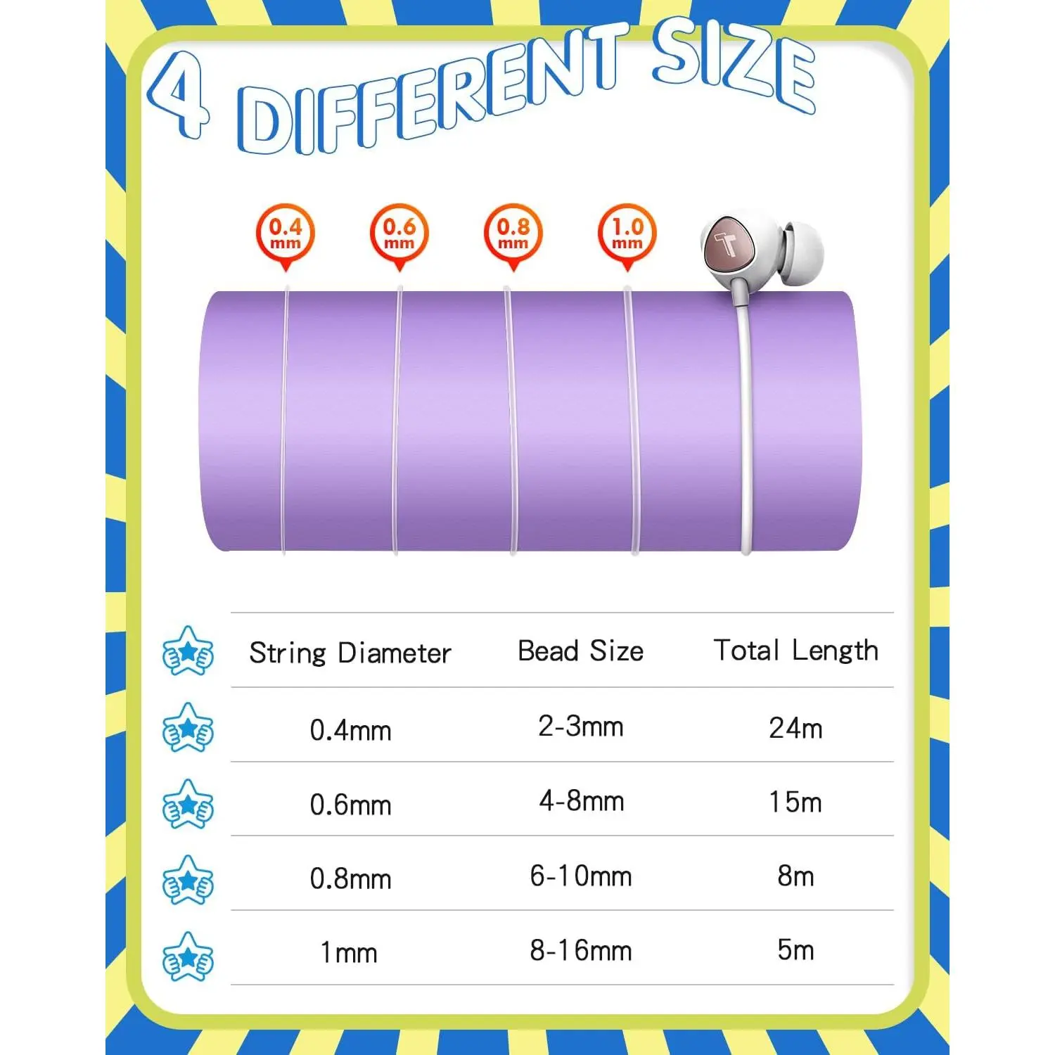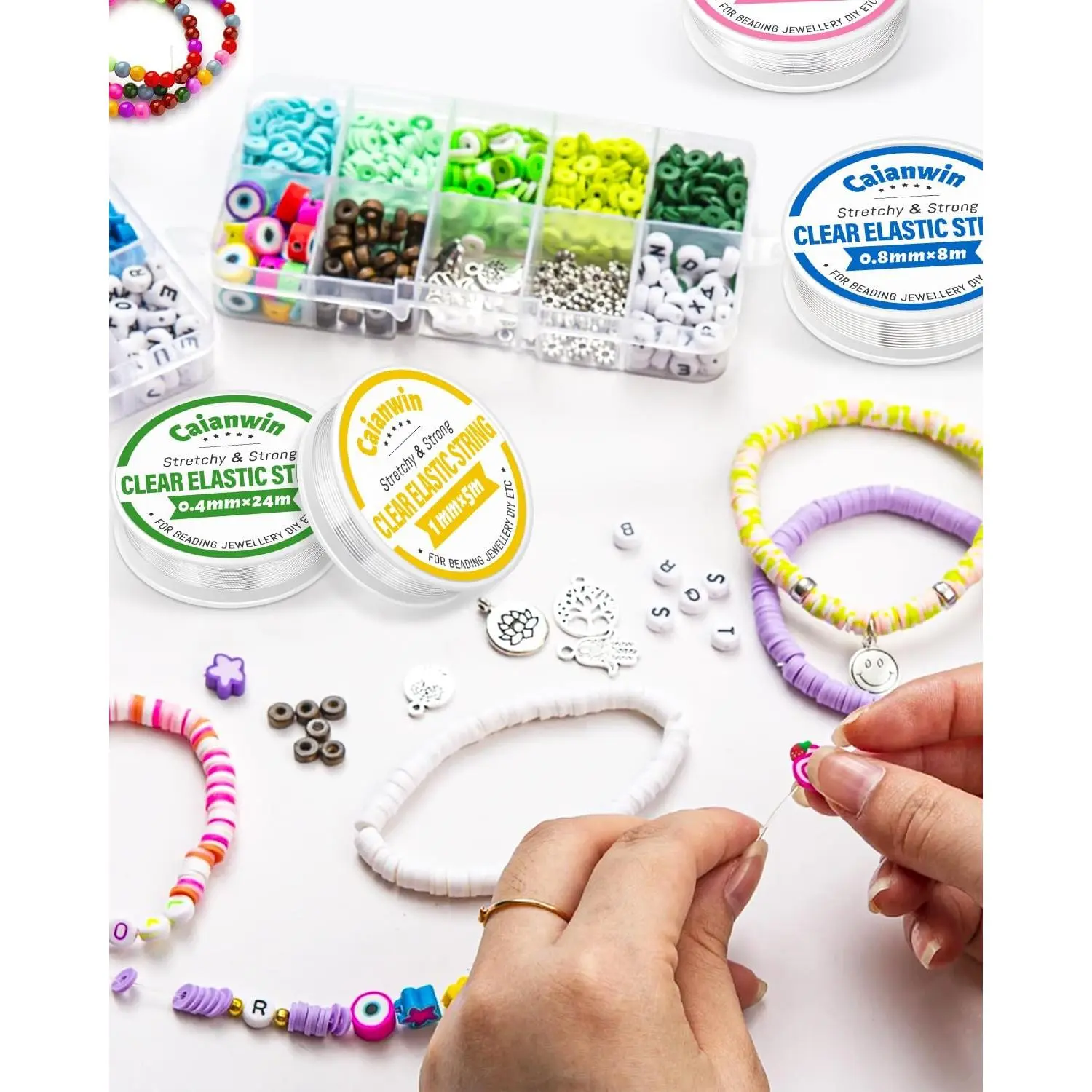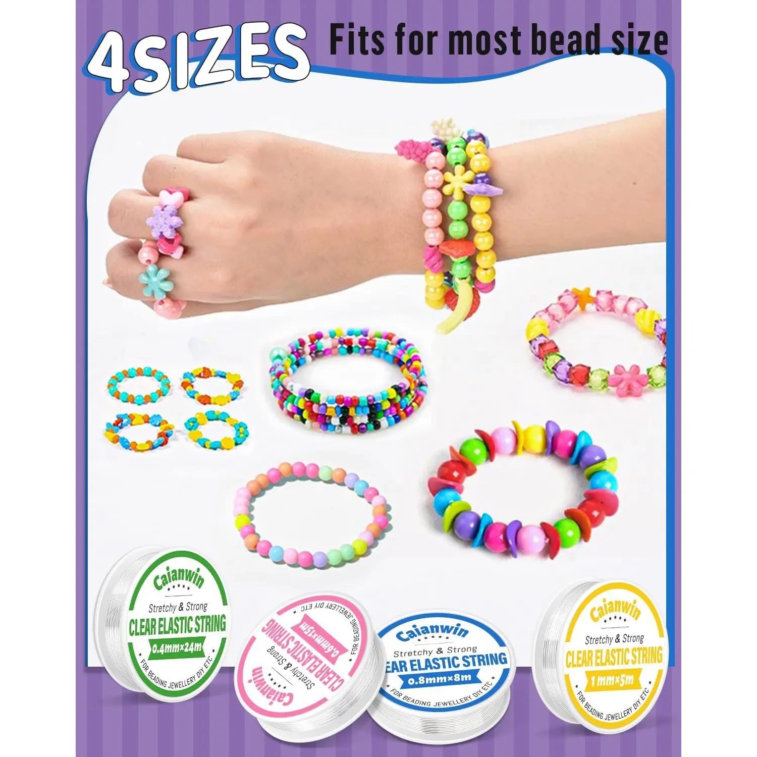 Caianwin Elastic Bracelet String Cord Set 4 Rolls Stretchy Bracelet String 0.4mm 0.6mm 0.8mm 1mm Transparent Beading Thread Clear Bead Cord for Beading, Bracelet and Jewelry Making