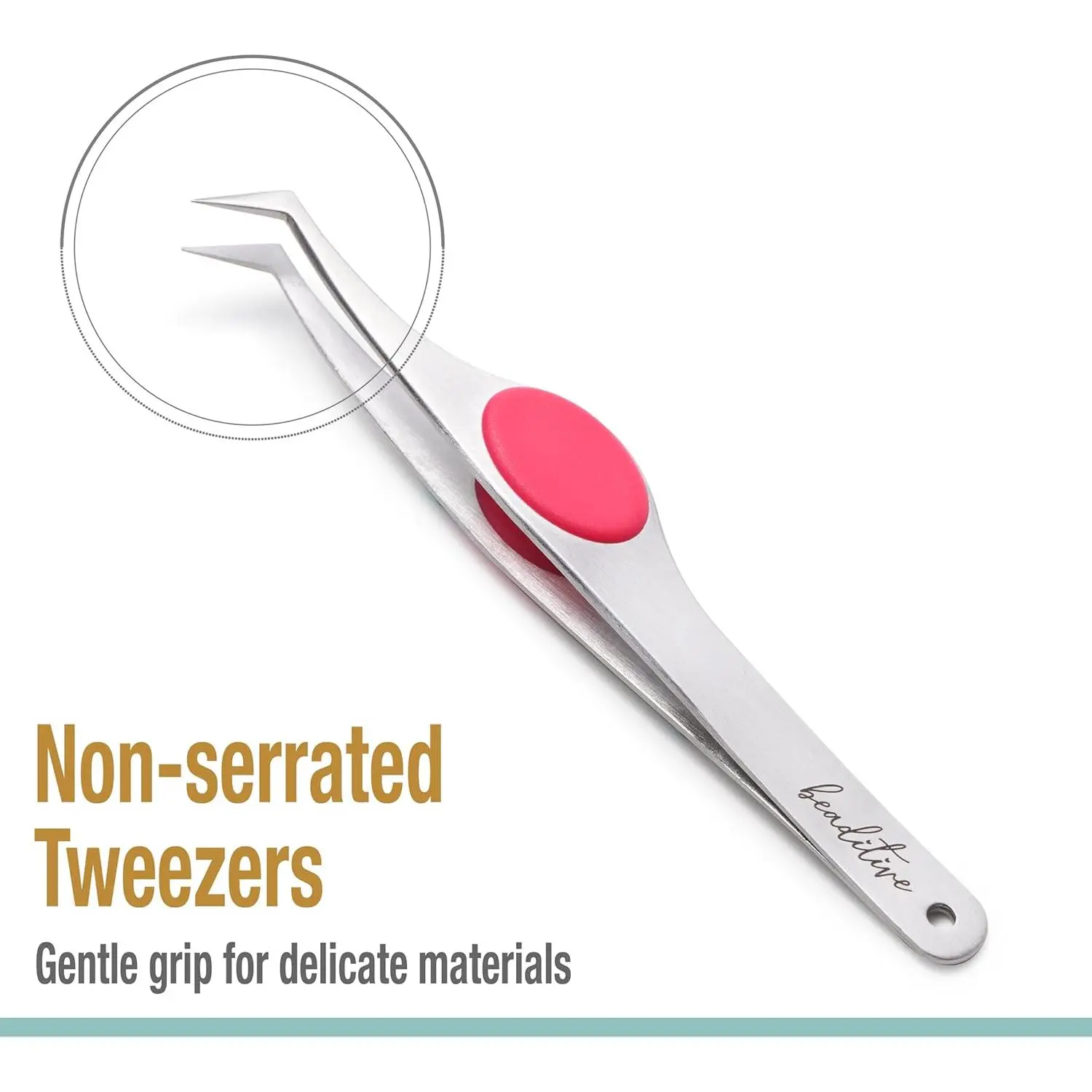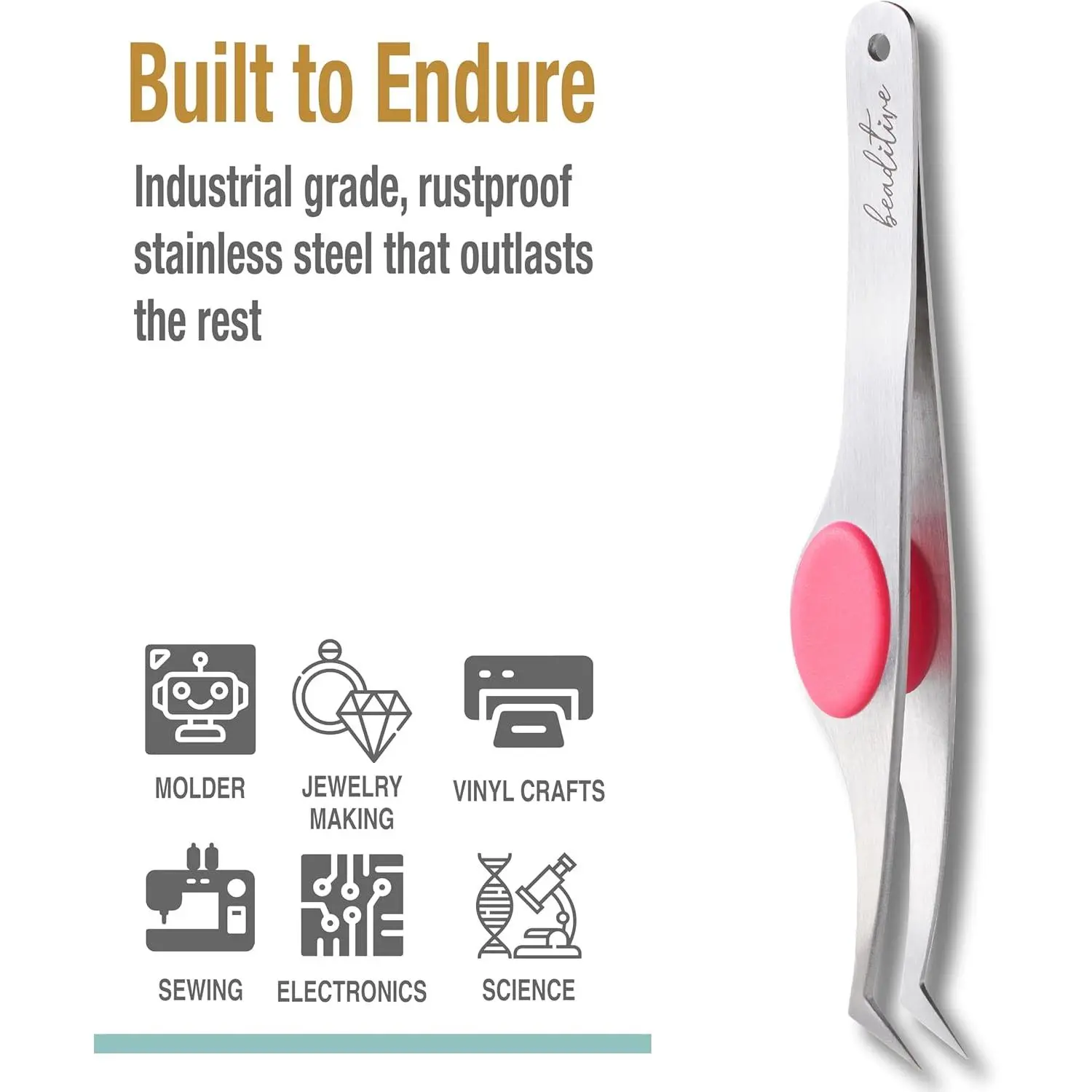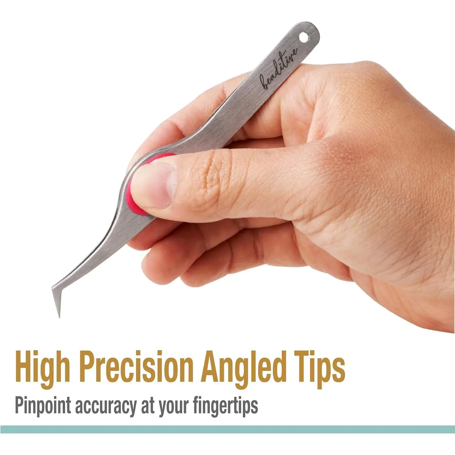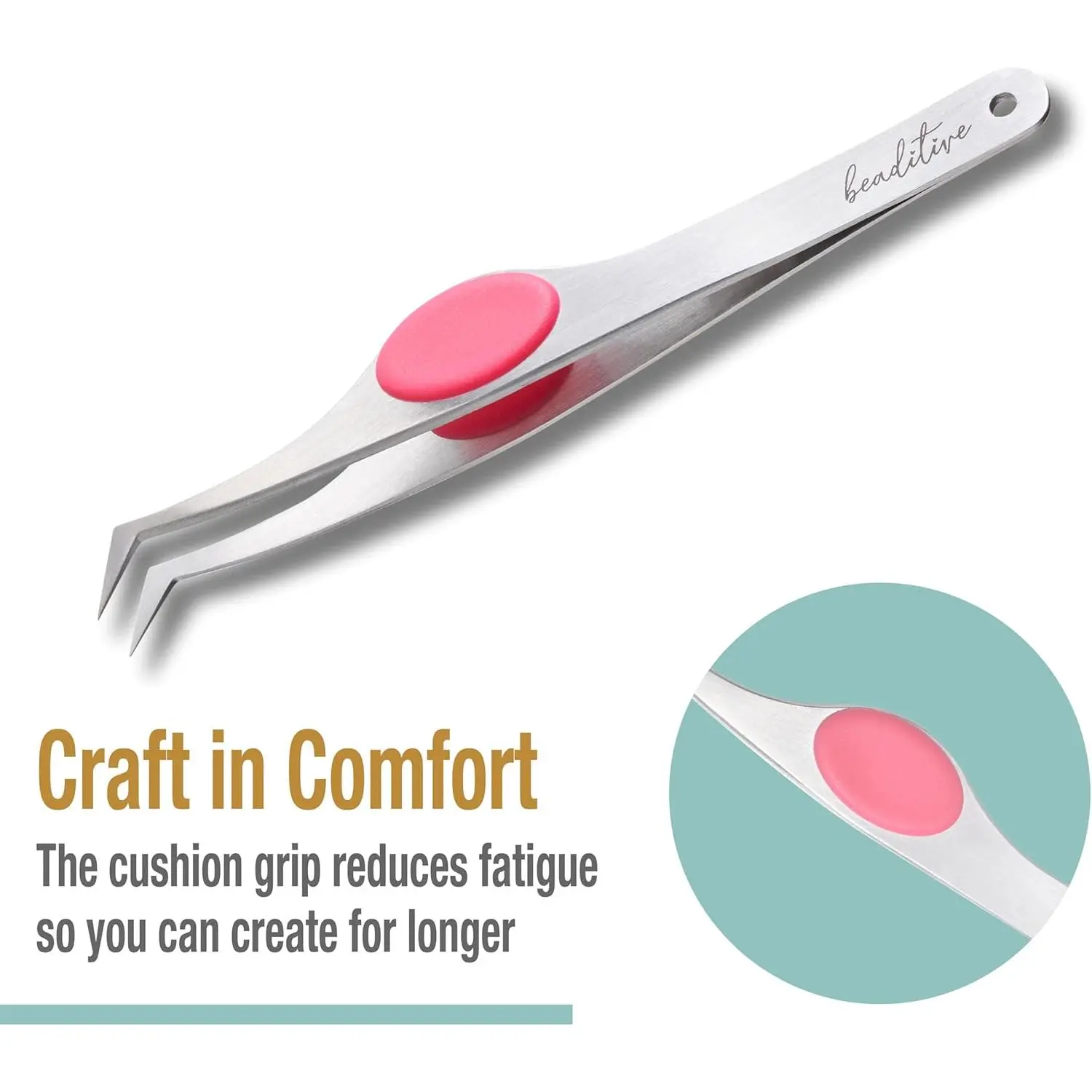 Beaditive High Precision Angled Tip Tweezers with Cushion Grip - 4.7" Craft Tweezers for Sewing, Beading & DIY Crafts - Non-Serrated Jewelry Tweezers with Fine Angled Tips - Stainless Steel (Fuchsia)