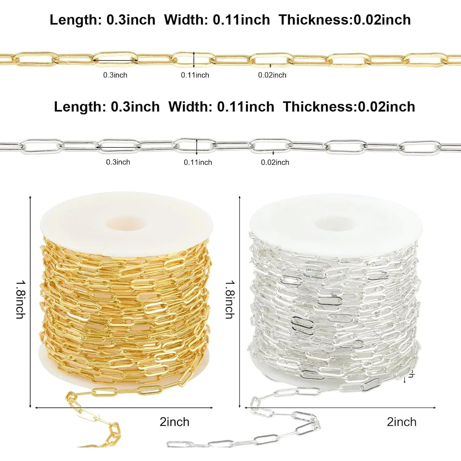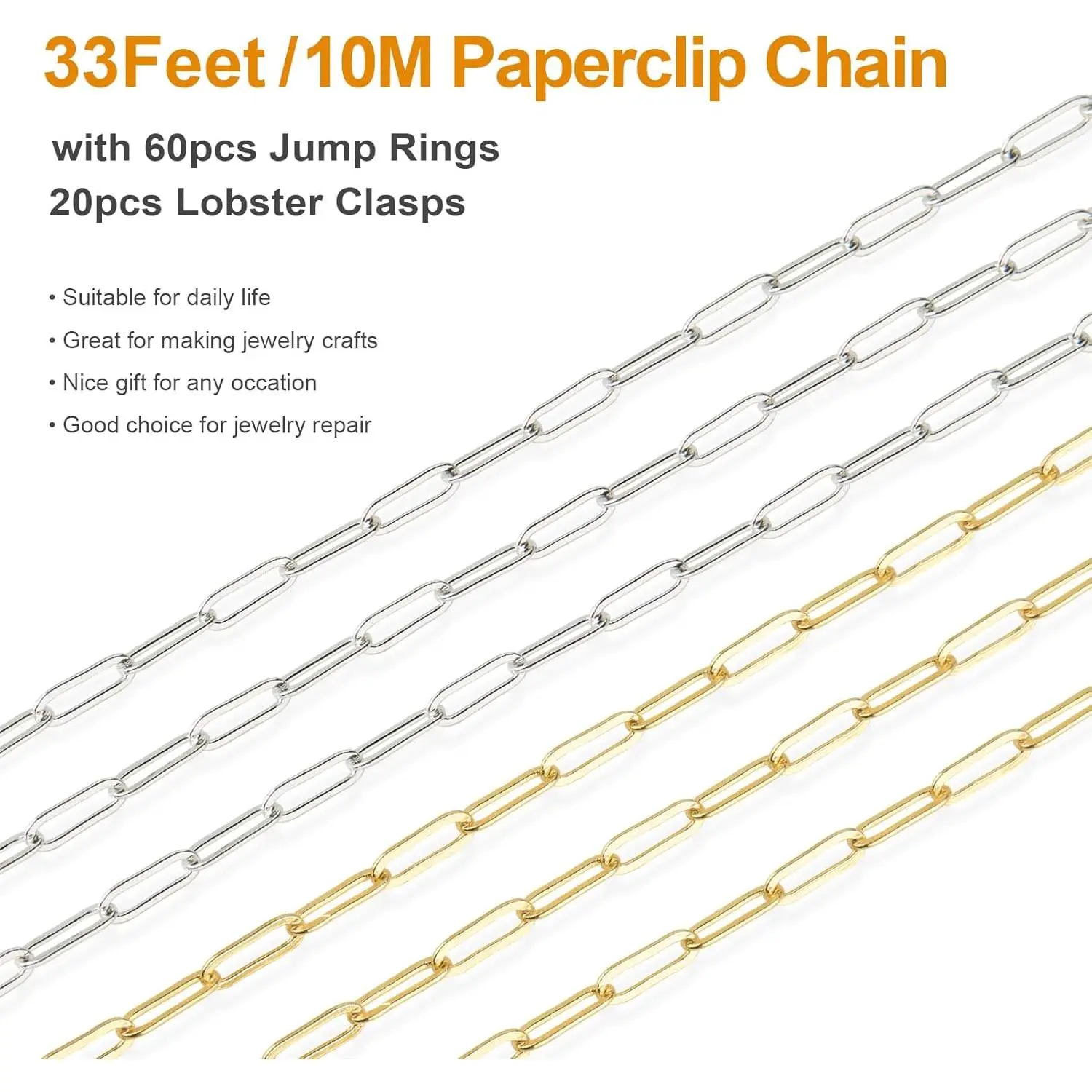 Kyutong 2 Rolls Paperclip Chain for Jewelry Making 32.8 Feet Jewelry Chain Links Silver and Gold Chains Bulk with Lobster Clasps and Jump Rings for DIY Craft Finding Jewelry Making Supplies