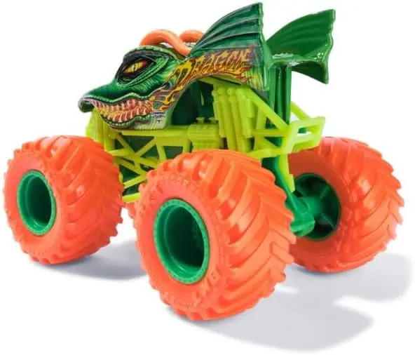 ·COLLECTIBLE DESIGN: Official Monster Jam 2024 die-cast truck featuring the Dragon Crazy Creatures design with distinctive orange wheels at 1:64 scale
