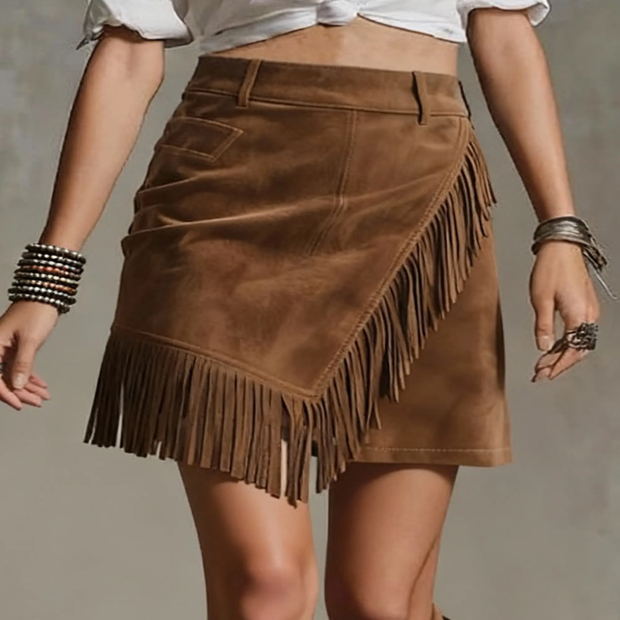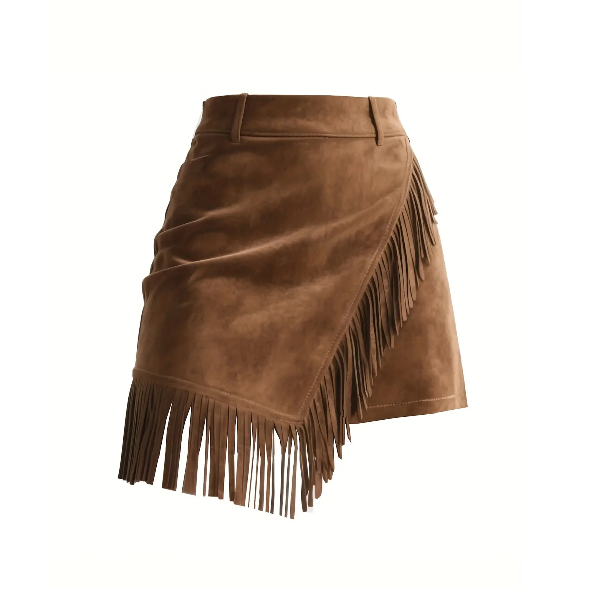 Woman's Faux Suede High Waist Bodycon Mini Skirt Asymmetric Fringe Camel Retro American Western Soft Breathable Versatile Casual Skirt For Street Dating Camping Music Festival