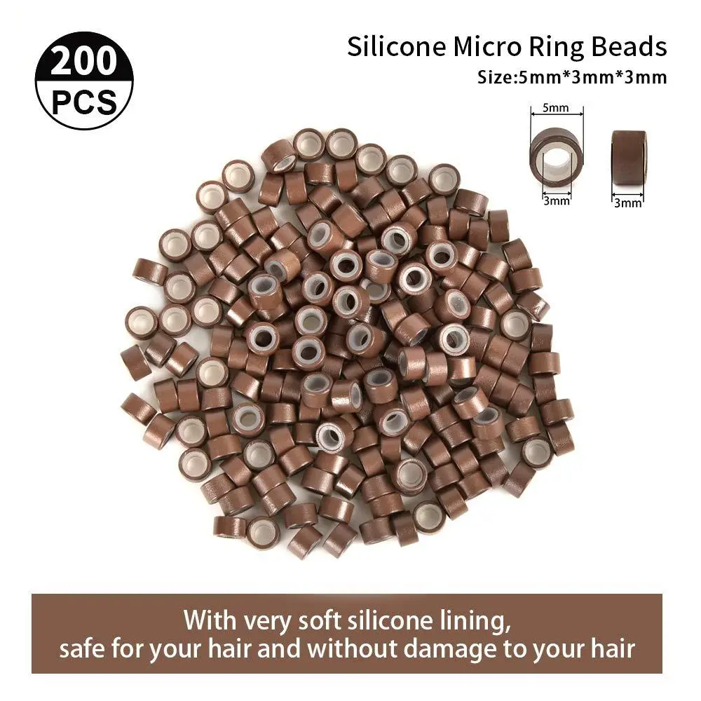 Hair Extension Tools Kit – Pliers - Pulling Hook - Bead Device Tools Kit with 200 Pieces 5mm Silicone Lined Micro Rings (200Pcs, Brown Beads)