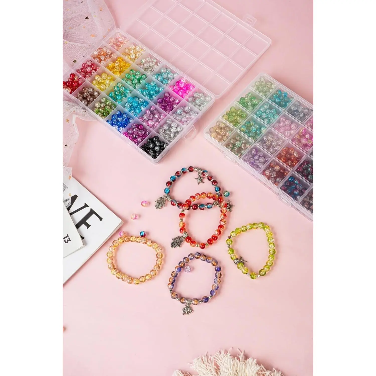 REVKI 1300PCS 8mm Mixed Crackle Glass Beads for Bracelets Making with Accessories, 48 Colors Crystal Glass Beads Jewelry Making Kit, Round Beads for DIY Bracelet Crafts
