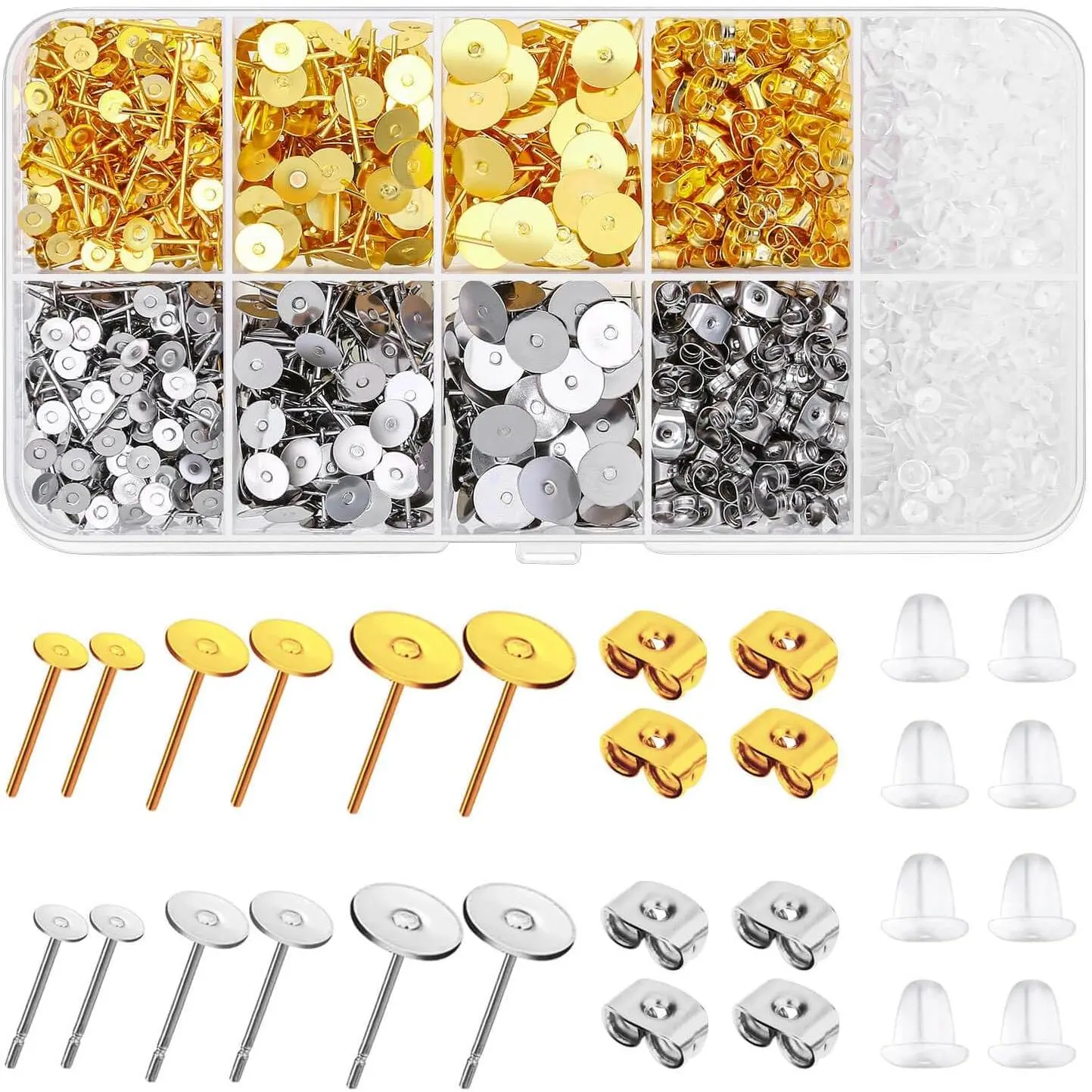 Hypoallergenic Earring Posts and Backs, Caffox 2000pcs Stud Earrings Making Kit with Ear Ring Base and Earring Backs for Leather Stud, Clay, Pearl Jewelry Making (Gold & Silver)