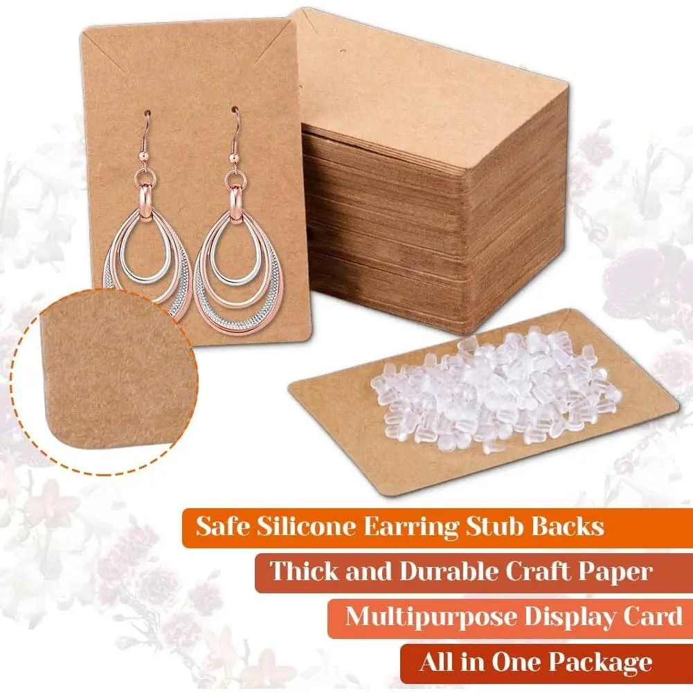 Anezus 100 Pcs Earring Display Cards with 200 Earring Backs and 100 Self-Sealing Bags for Earrings, Necklace & Jewelry Display, Kraft Color 3.5x2.4 Inches