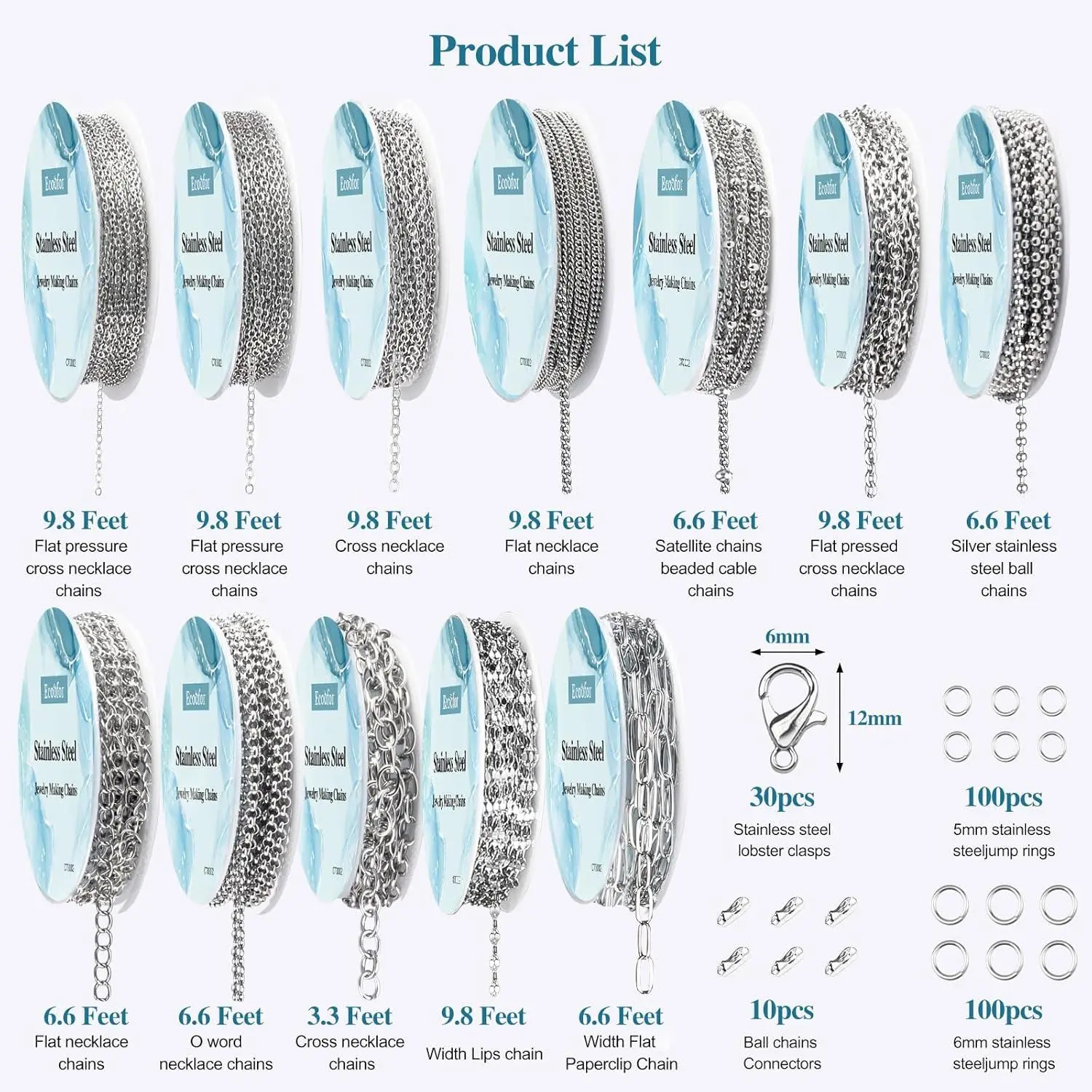 Necklace Chain for Jewelry Making, 95.1 Feet 12 Rolls Stainless Steel Jewelry Chains for DIY Necklace Bracelet Making with Stainless Steel Jump Rings/Lobster Clasps/Connectors
