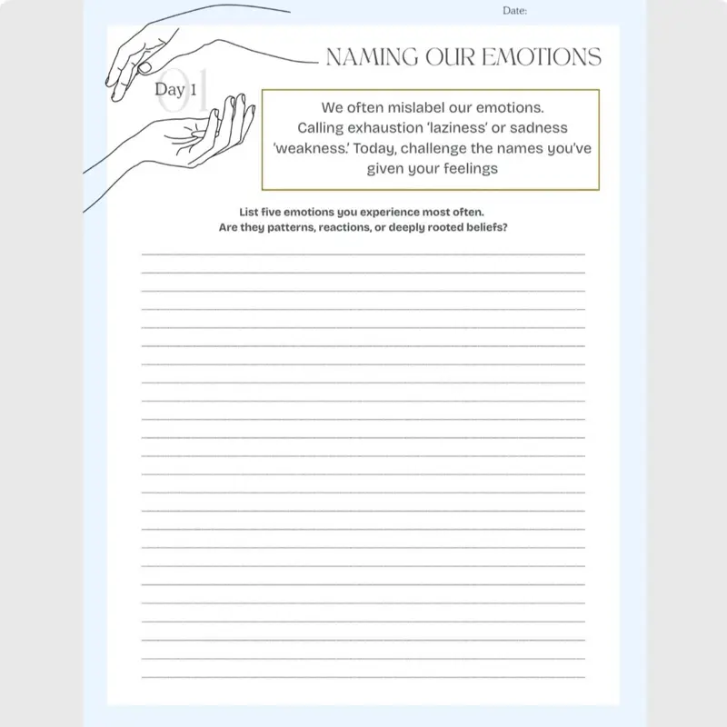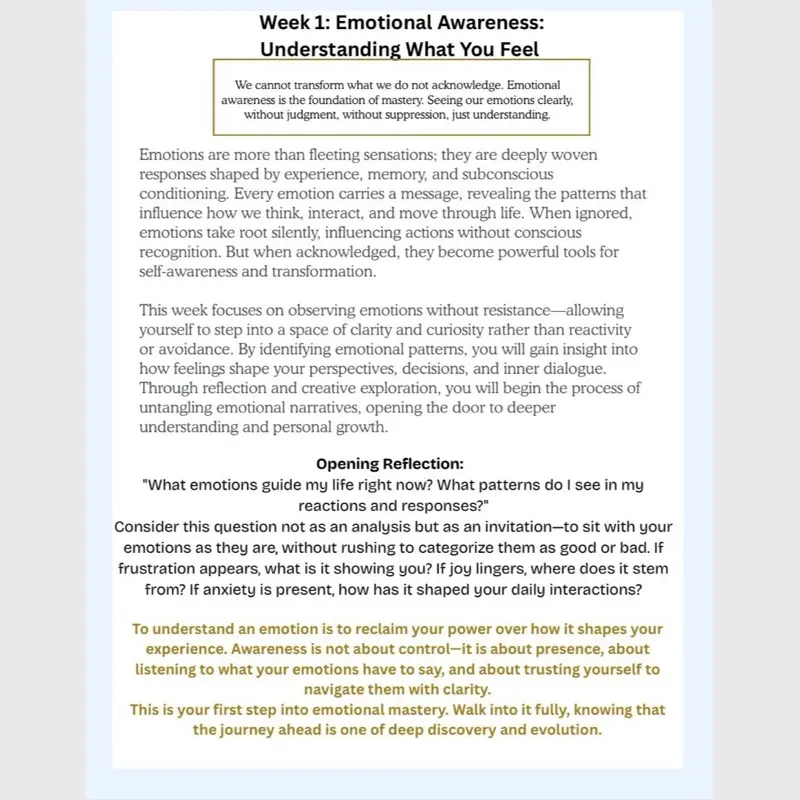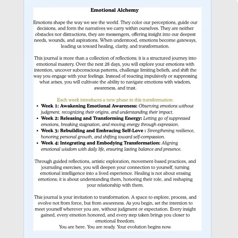 A 28-day guided journey to emotional awareness, healing, and transformation. Move from reaction to wisdom with reflective prompts, creative exercises, and powerful self-discovery practices. Embrace clarity, release emotional weight, and integrate lasting self-love.