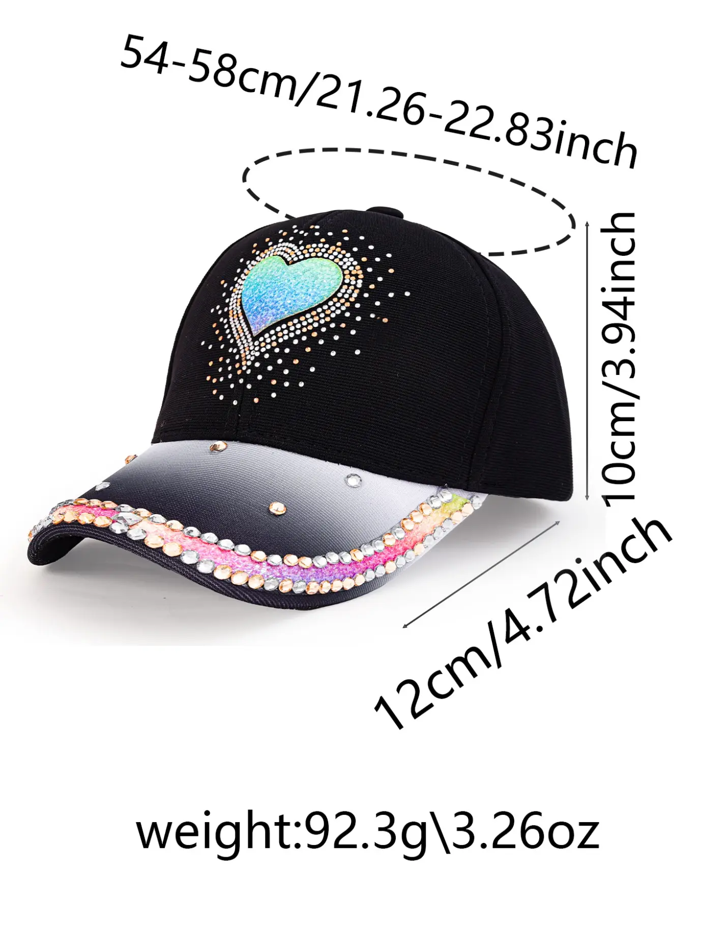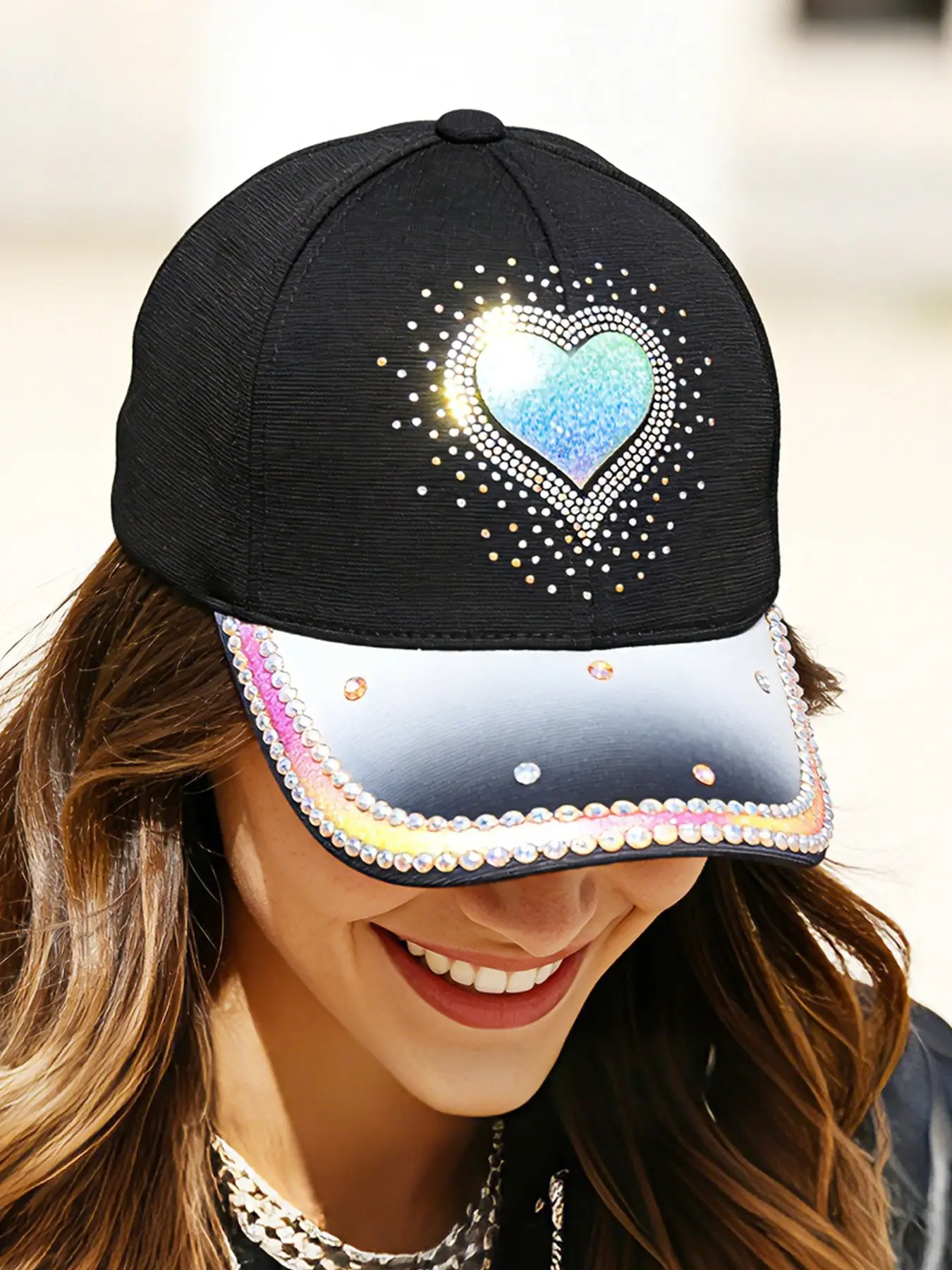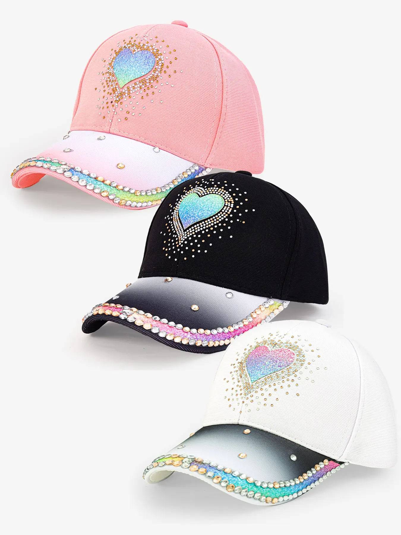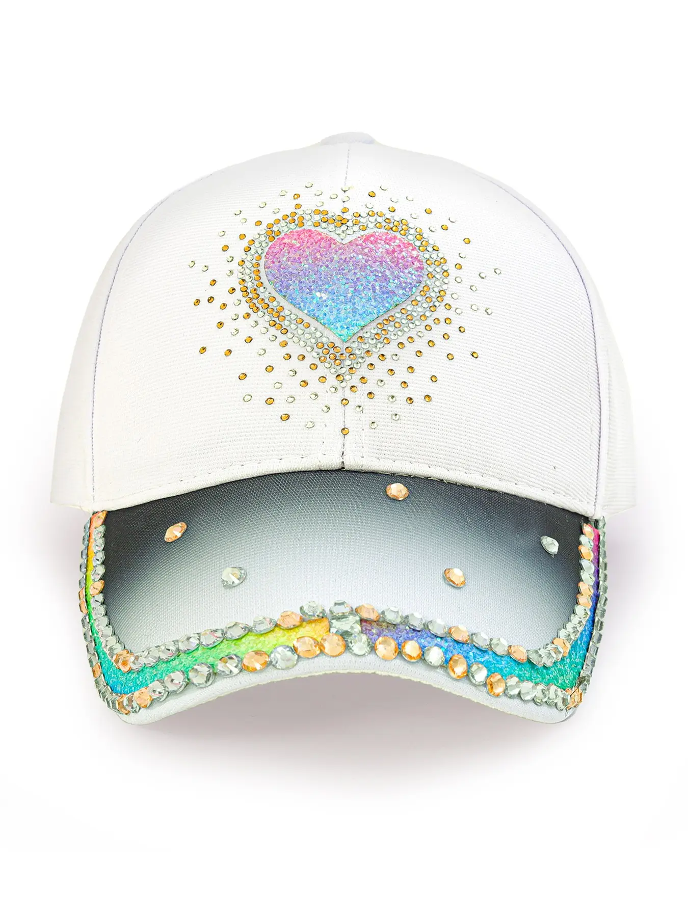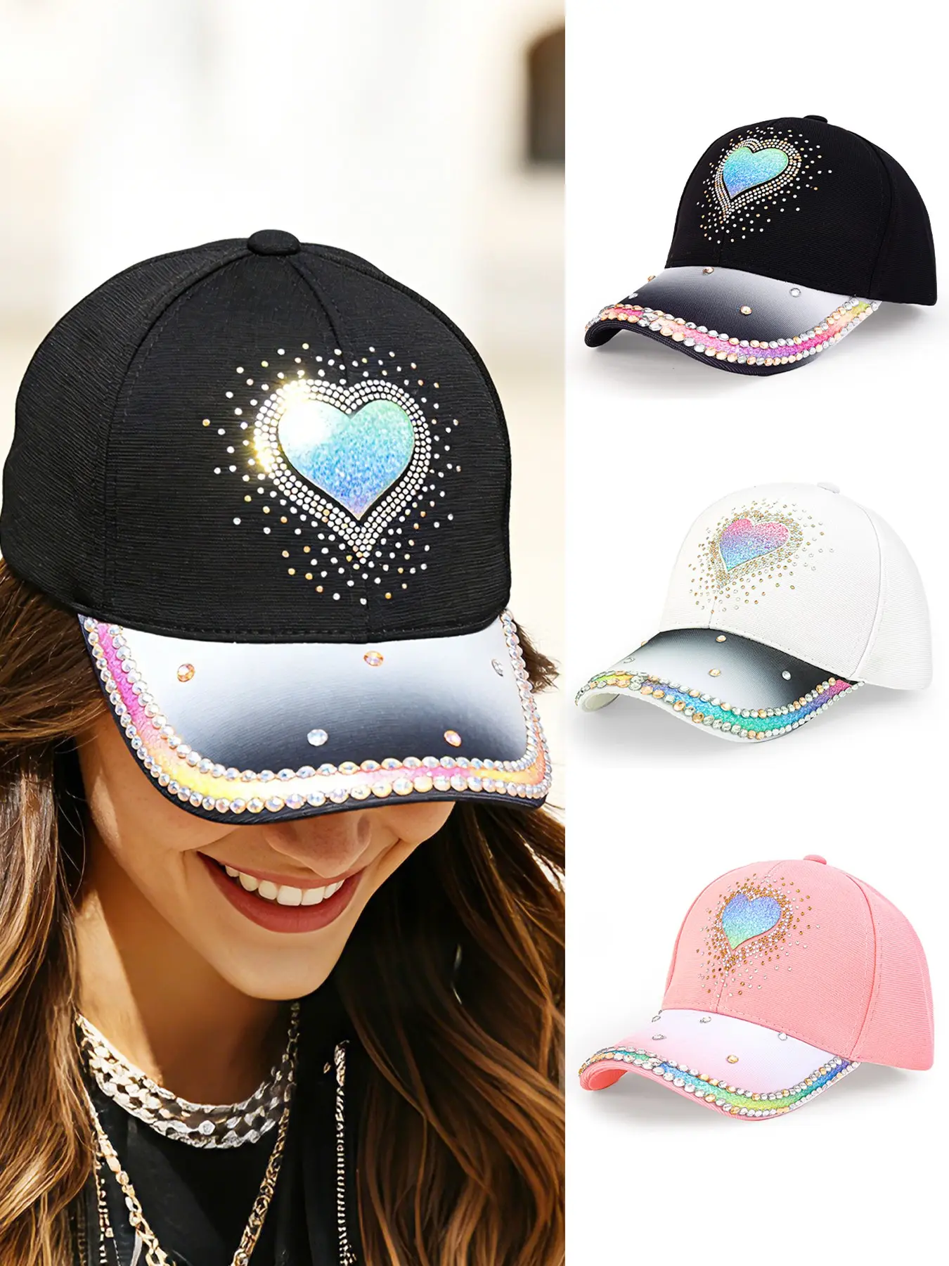 Elevate your style with this stunning women's gradient heart rhinestone baseball cap! Combining bling rainbow rhinestone details with a classic baseball cap design, this cap is the ultimate statement piece for your wardrobe, perfect for fashion-forward women who love to stand out.