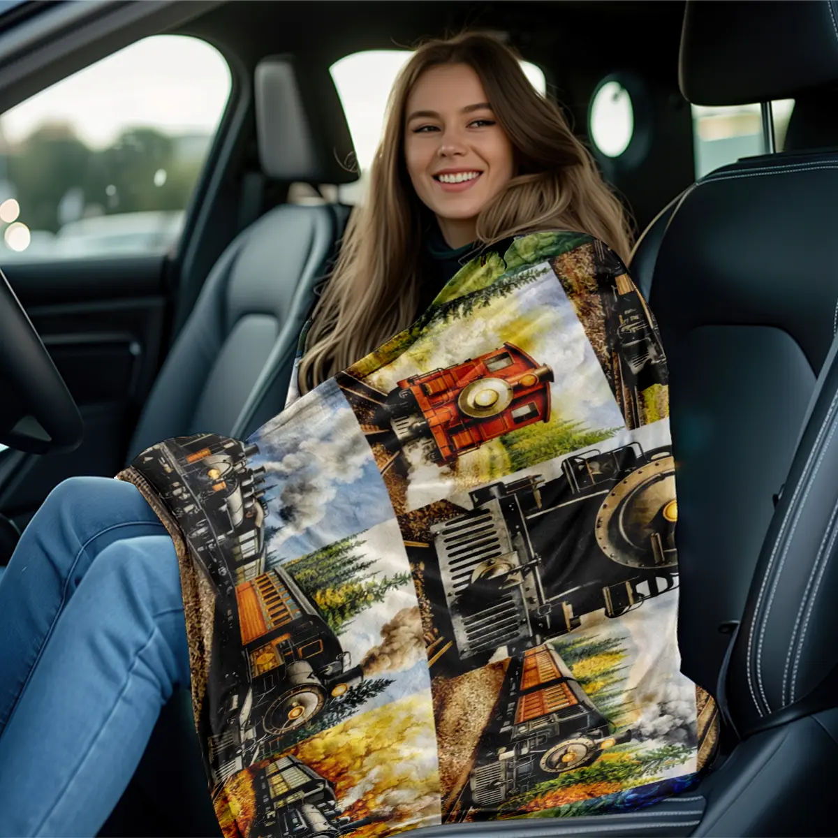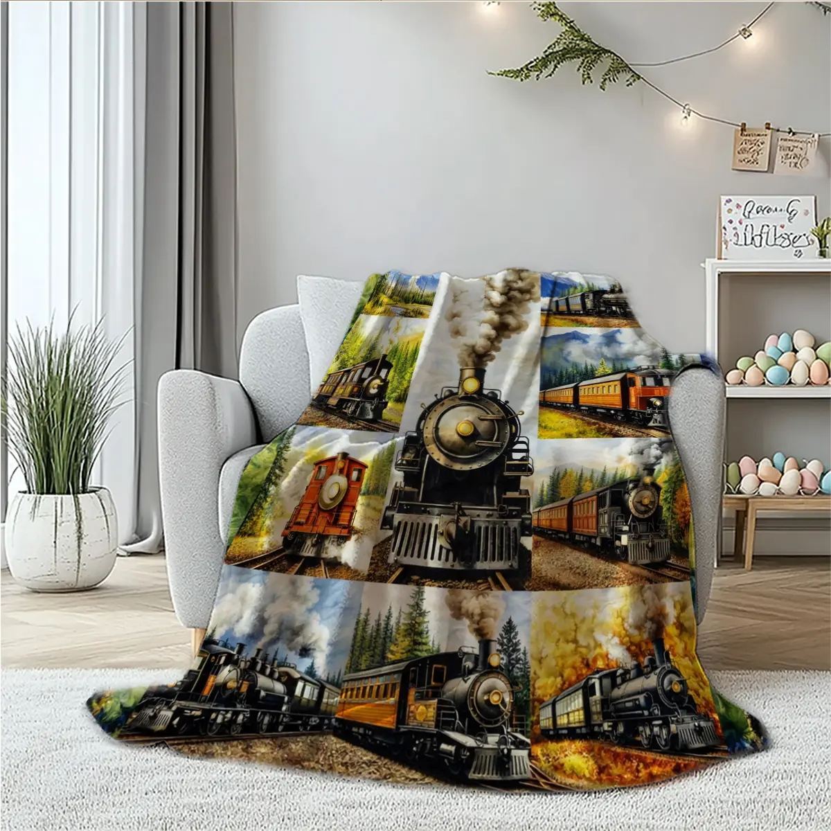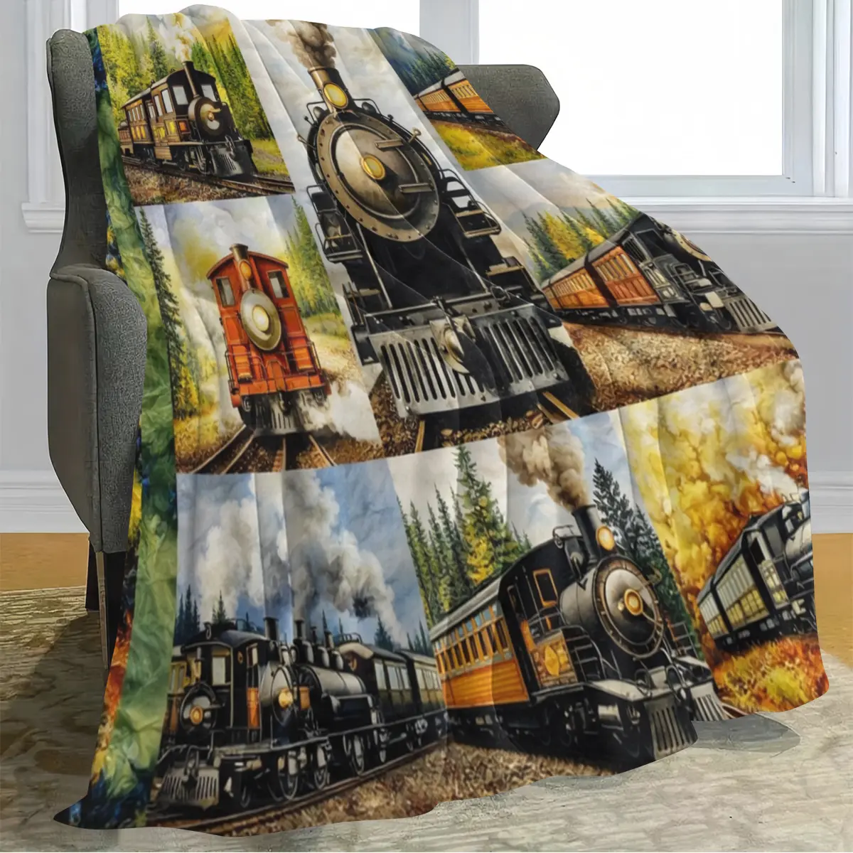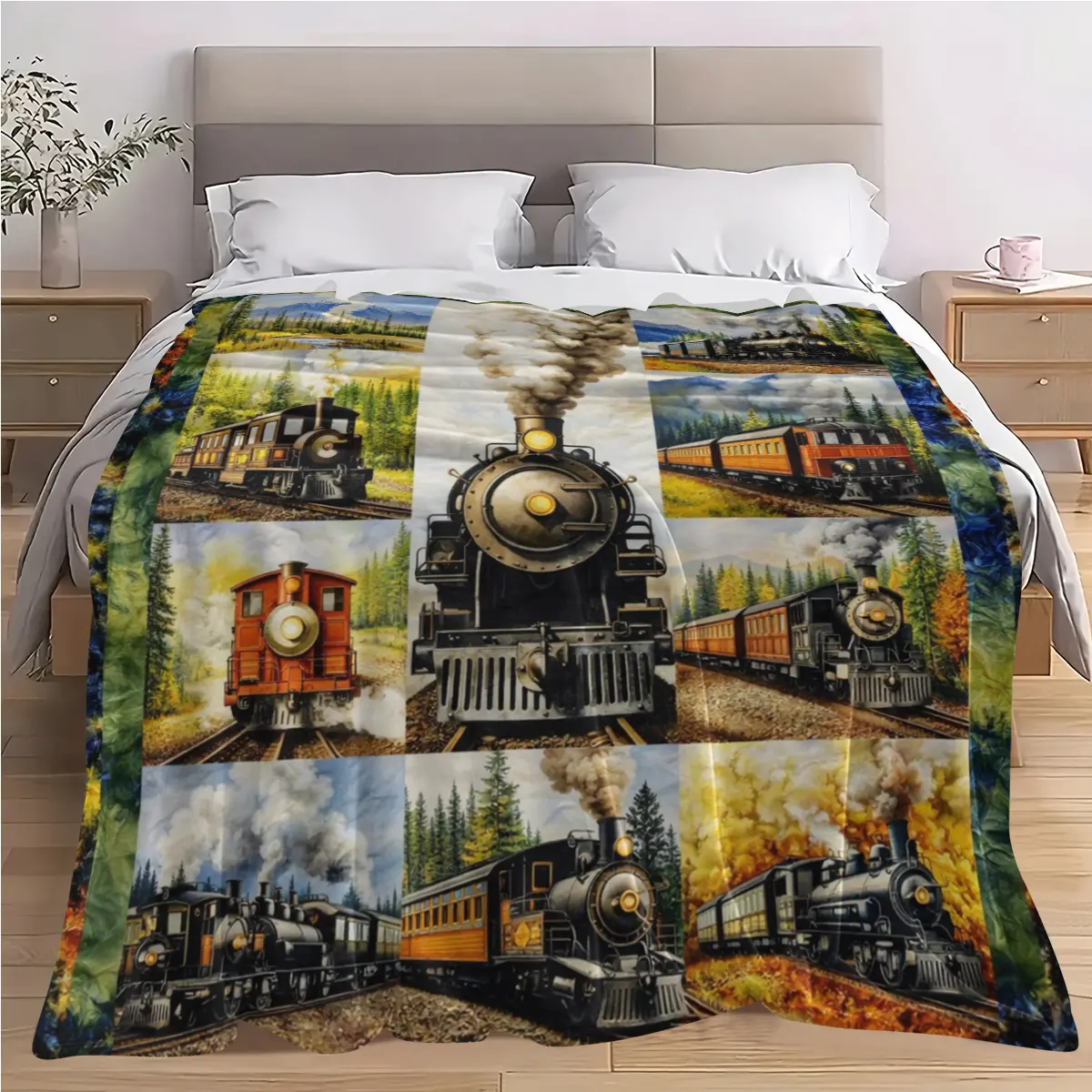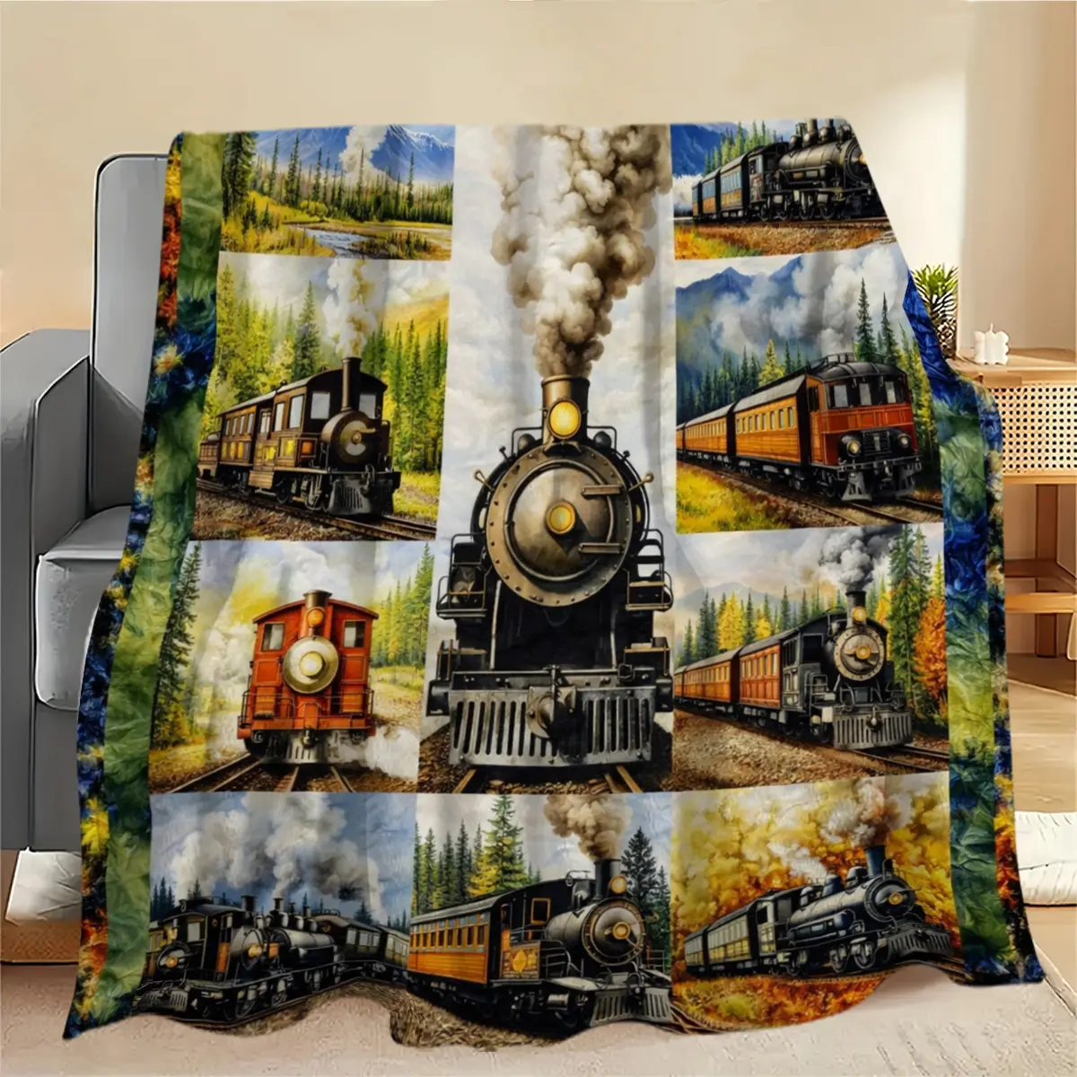 American retro steam train oil painting–style flannel blanket with an oil painting texture and warm natural landscape tones, creating a nostalgic, soothing atmosphere. Suitable for American retro decor, kids’ rooms, motorcycle-themed homes; can be used as