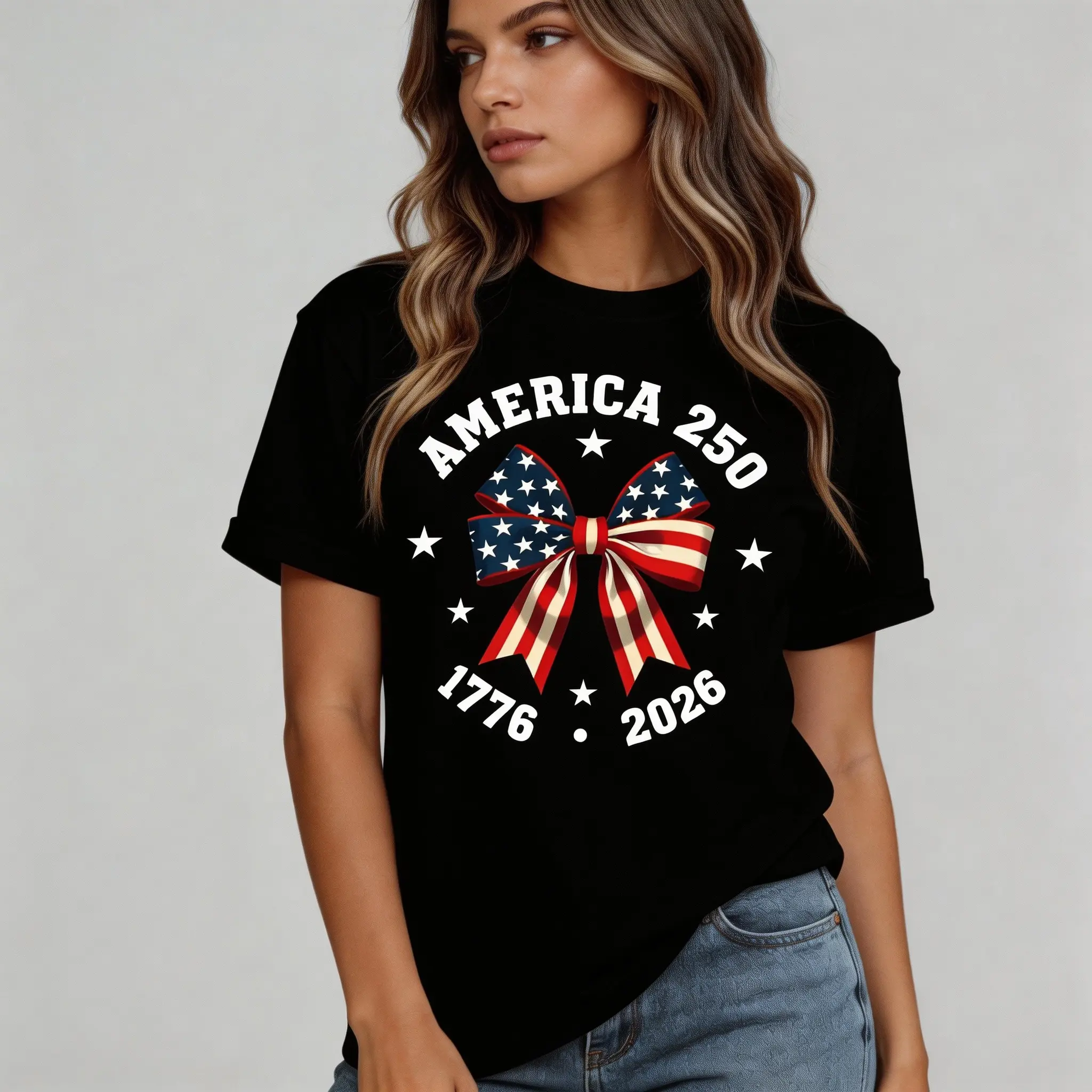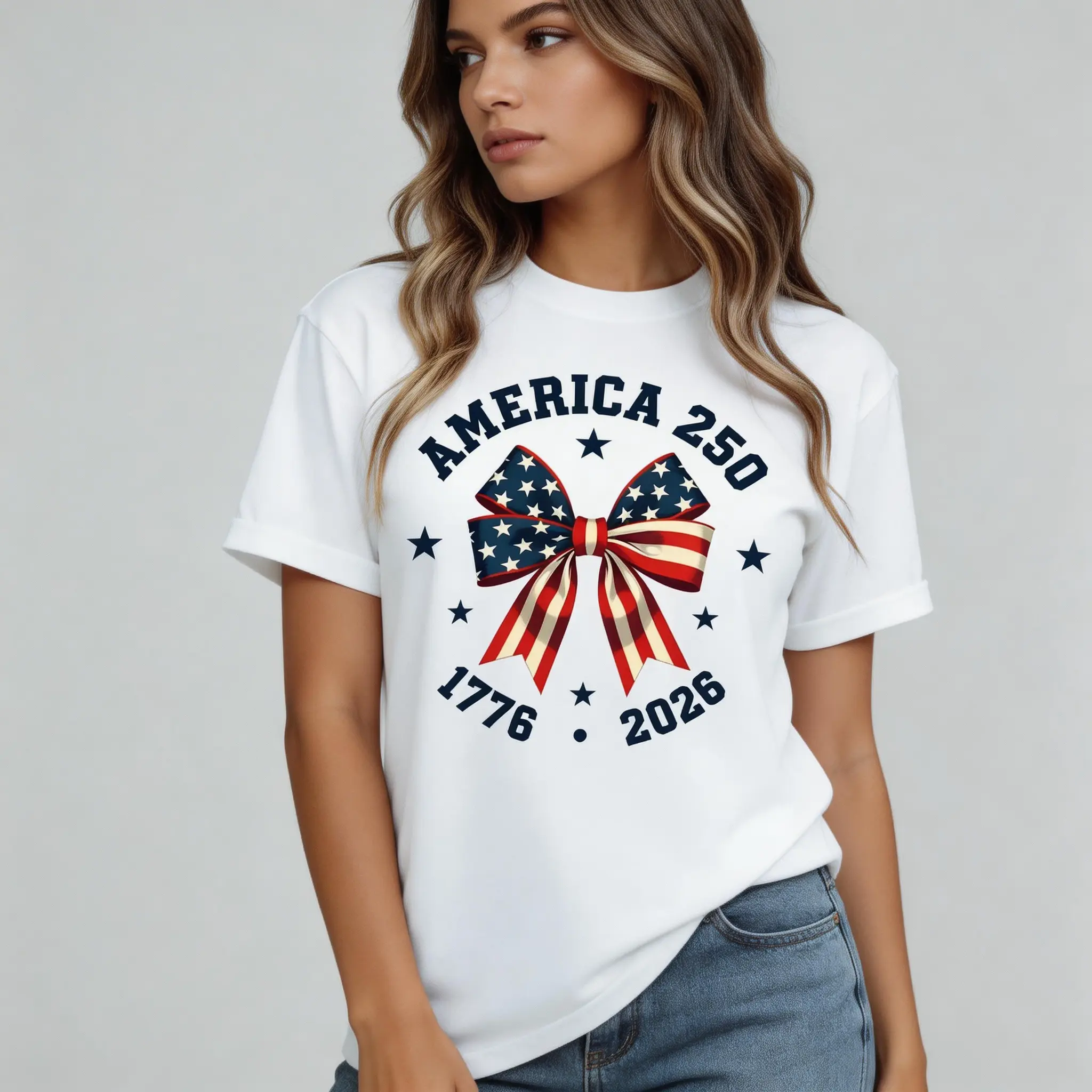 250 Stars And Stripes Bow Print T Shirt White Crew Neck Casual Top For Independence Day Celebration