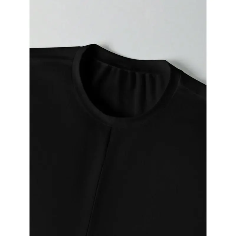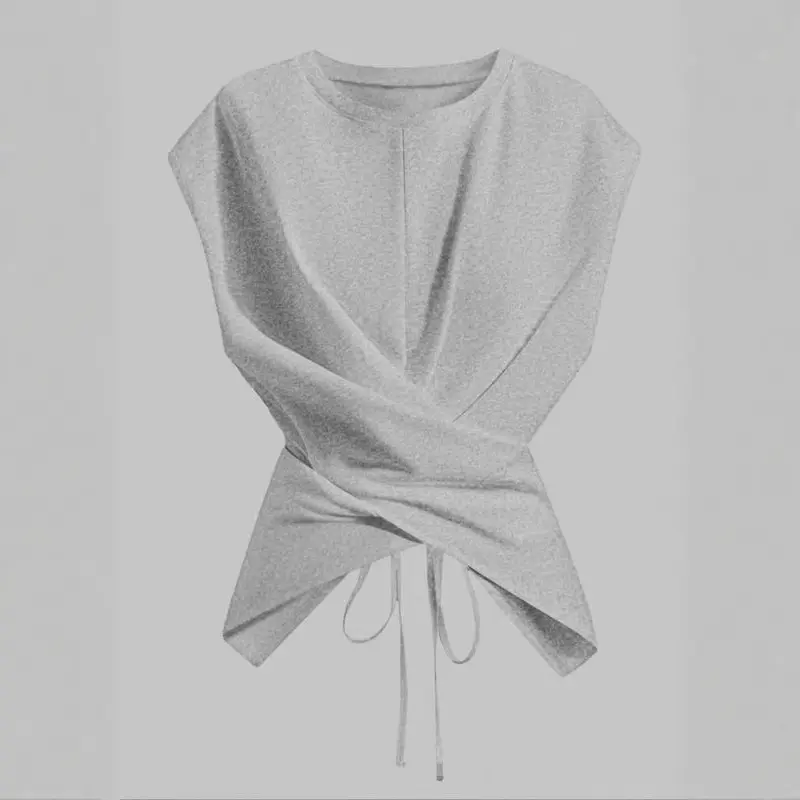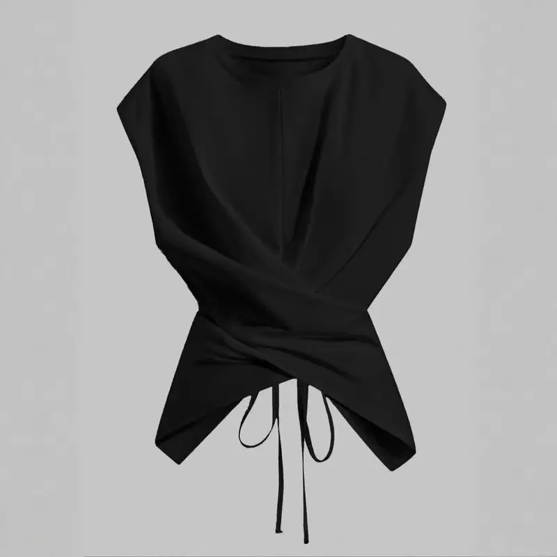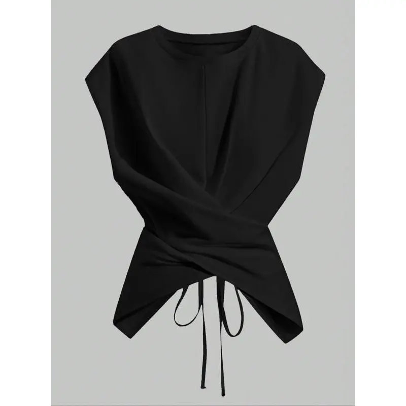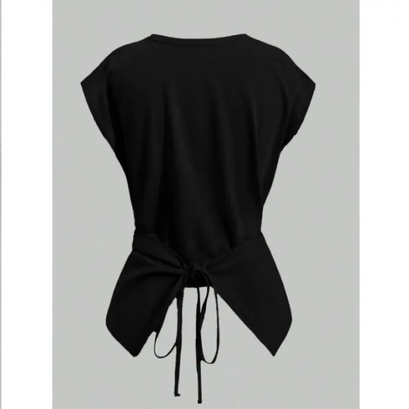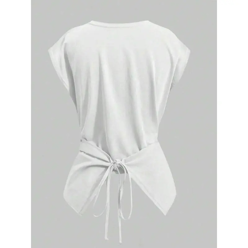Women's Knitted Round Neck Drop Shoulder Sleeve T-Shirt, Fashion Casual Chic Asymmetrical Ruched Cross Cutout Back Tie Top