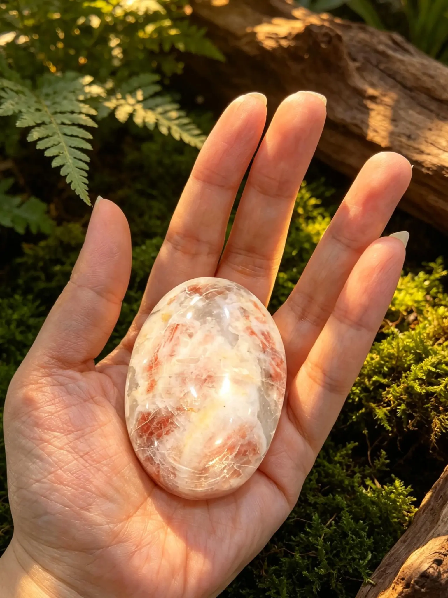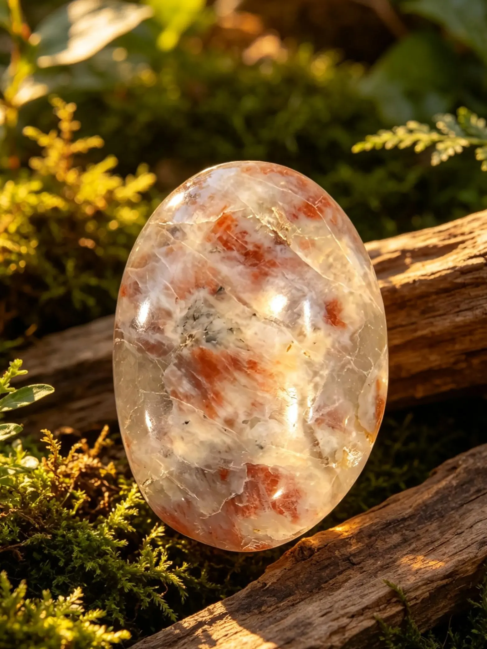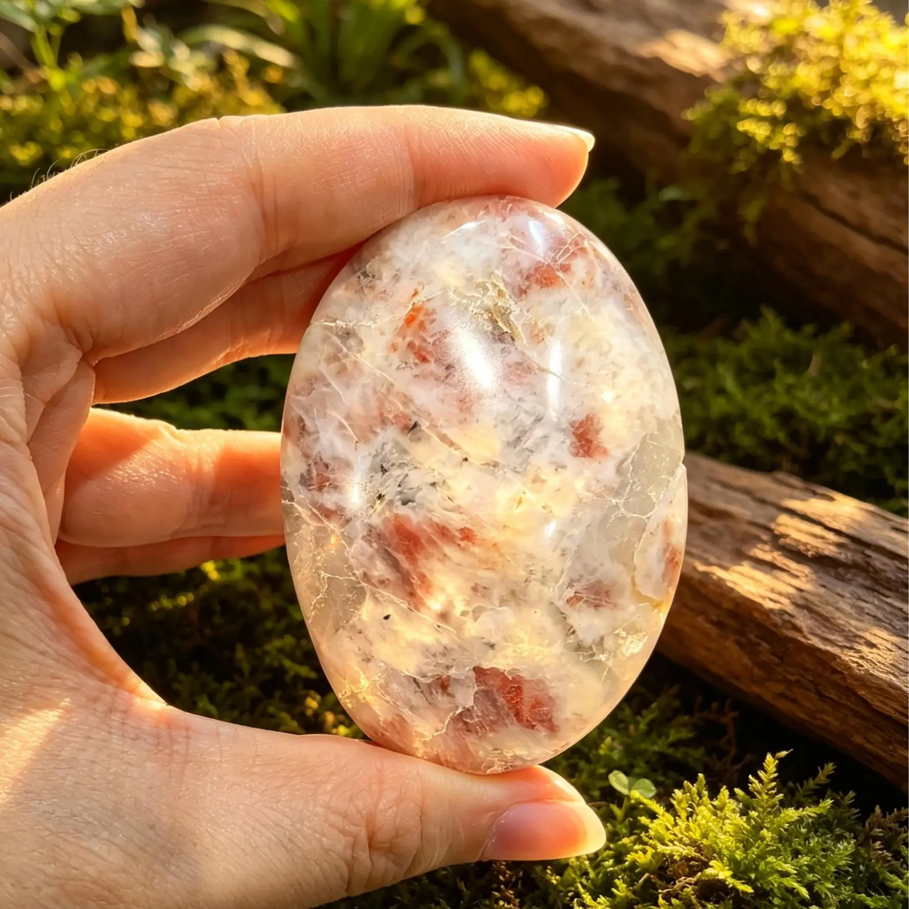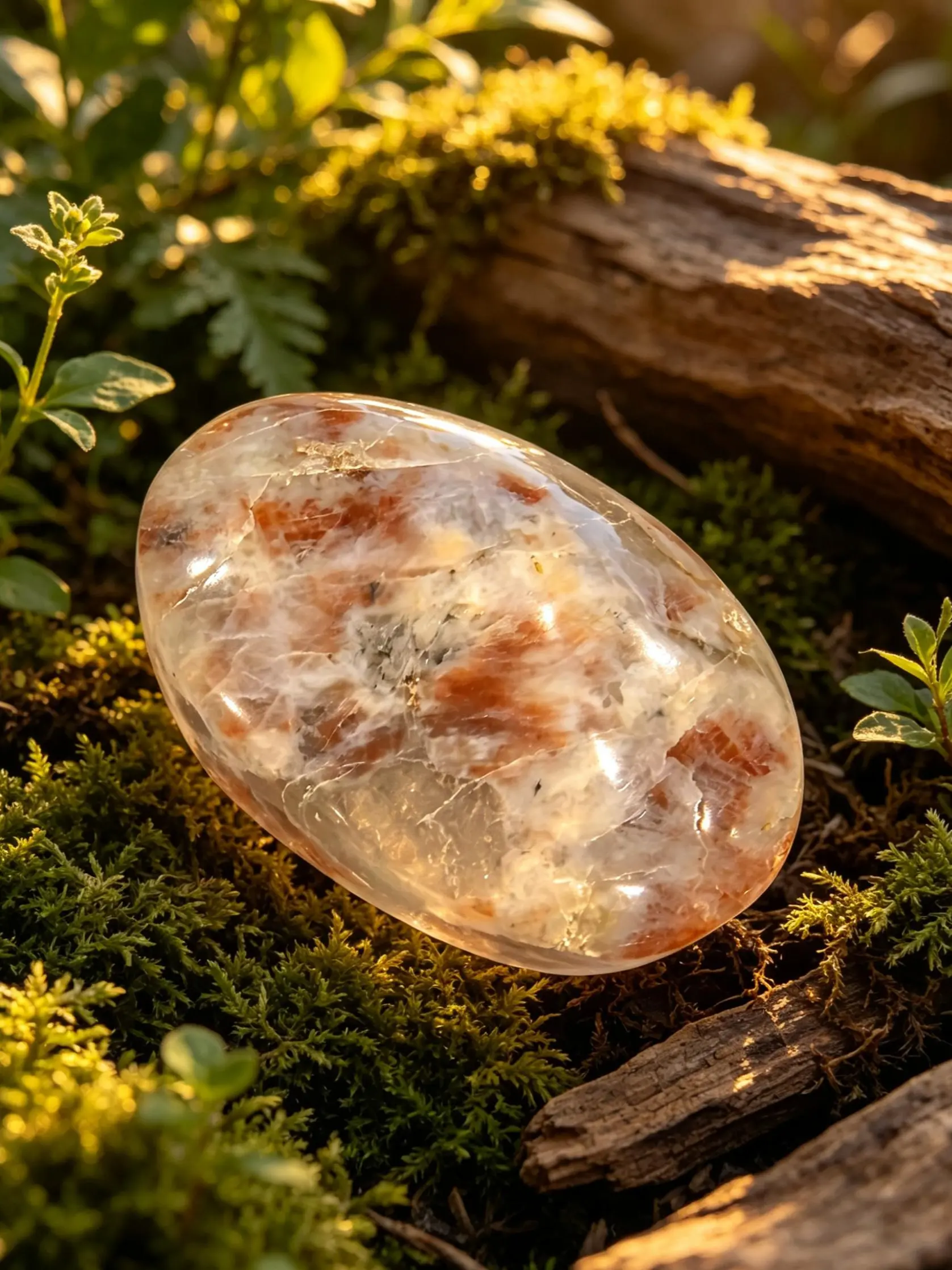 Sunstone: Boasts a stunning aventurescence with golden/peach sparkles that shimmer like sunlight. Known as the stone of joy, vitality, and confidence, it fuels creativity and dispels negativity ️