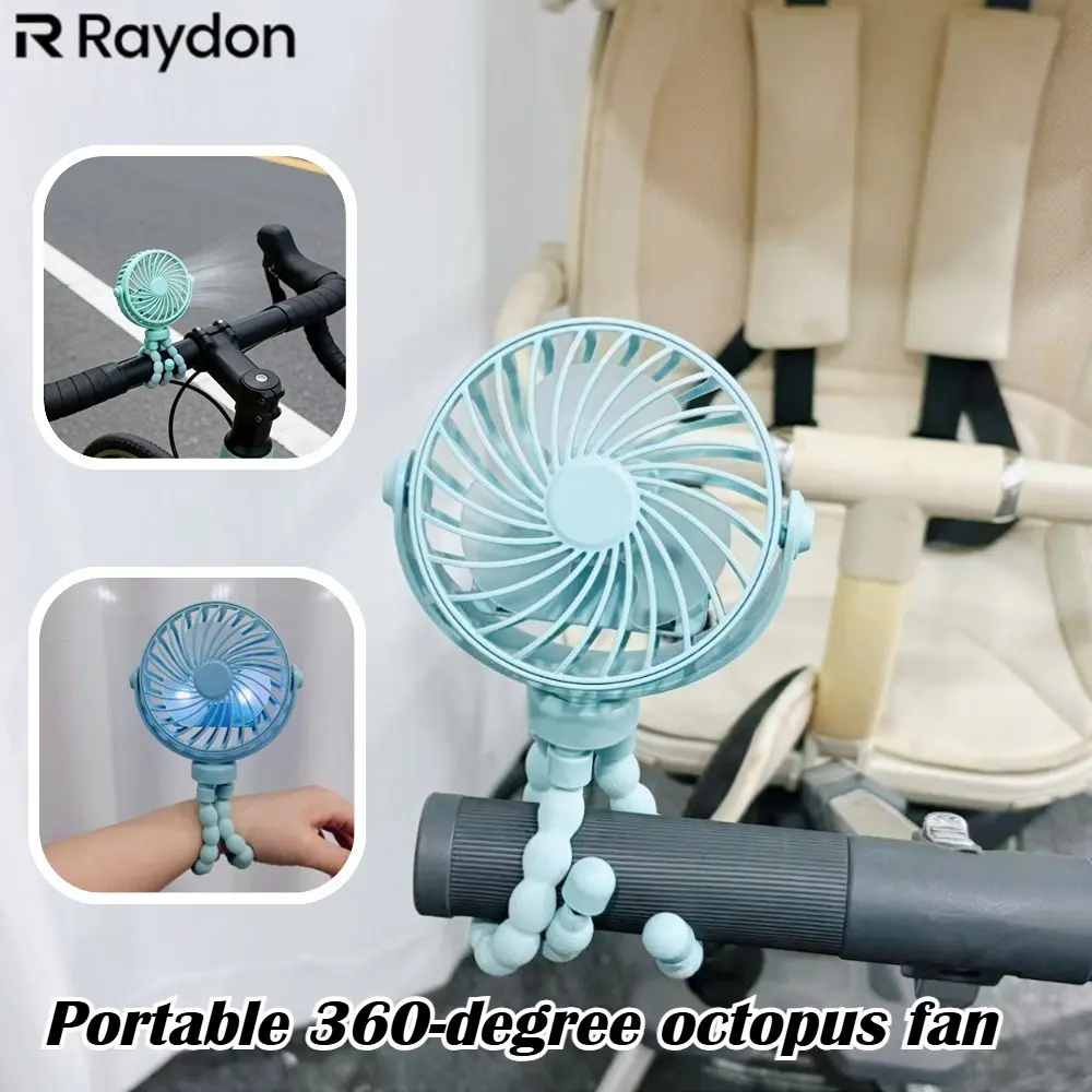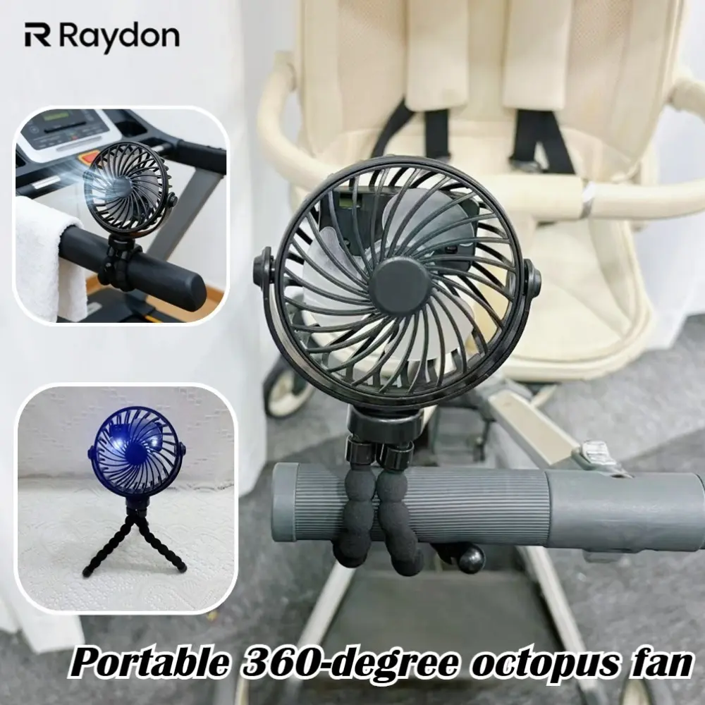 USB Rechargeable 360° Rotating Octopus Fan - Flexible Tripod, USB Rechargeable, Multi-Speed Cooling with Night Light