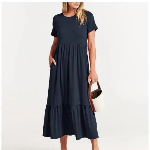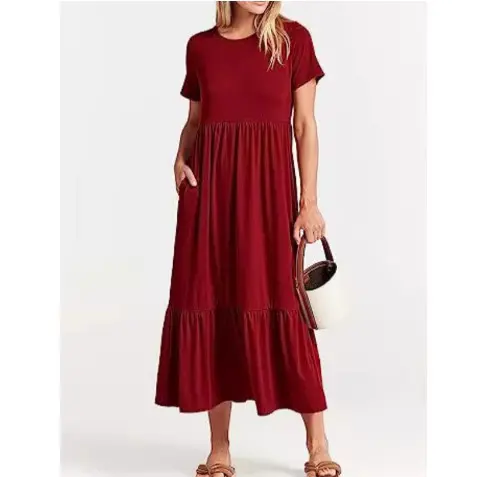 Classy Round Neck Ruched Bodice Solid Flowy A-Line Long Dress