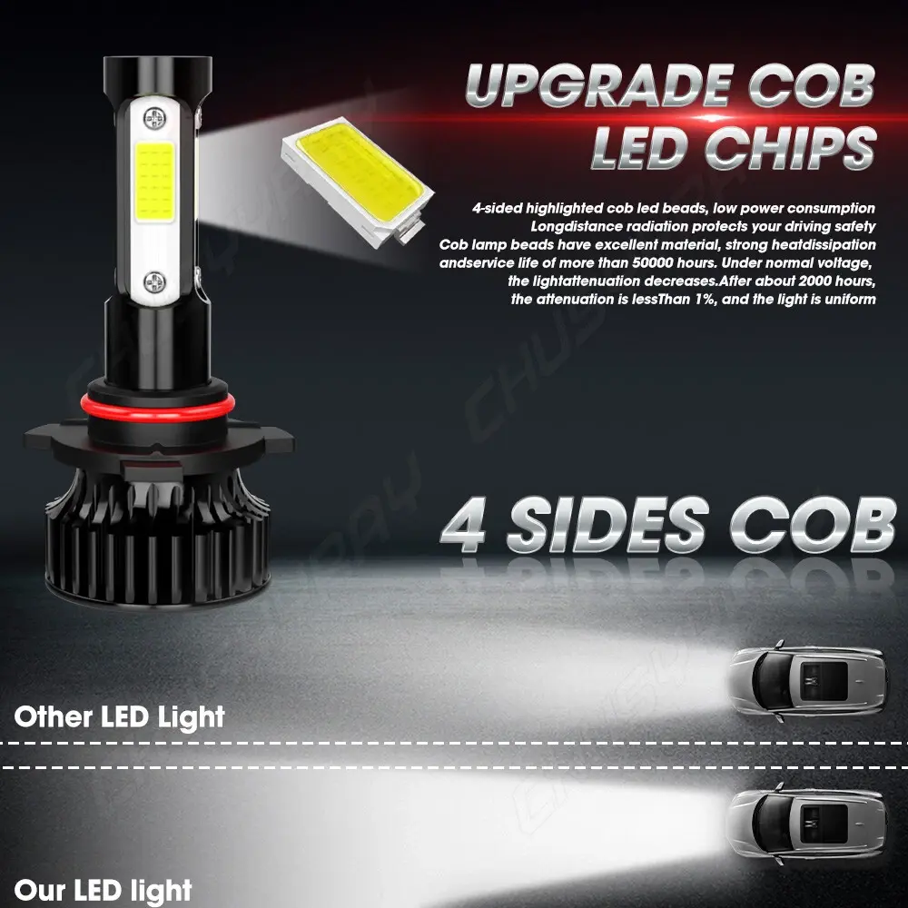 Compatible With: Brand LED chip light source Plug Type: 9005 /HB3 , High Low Beam/Fog Light Operating Voltage: DC 9-32V(fit 12V,24V vehicles) Color Temperature: Pure White 6000K Usage: High Low Beam Headlight , Foglight LED light emission style: 4 sides LED COB (Fanless) Heat Dissipation Theory: Heat Pipe Technology + A380 Aluminum Heatsink Canbus Driver: No (may not work with CANBUS vehicle) Waterproof:IP67 rated water and dust seal Beam angle:360 degree beam angle Operating Temperature: -40-80 degree Celsius Over 50000hrs lifetime Number of Bulbs: 2