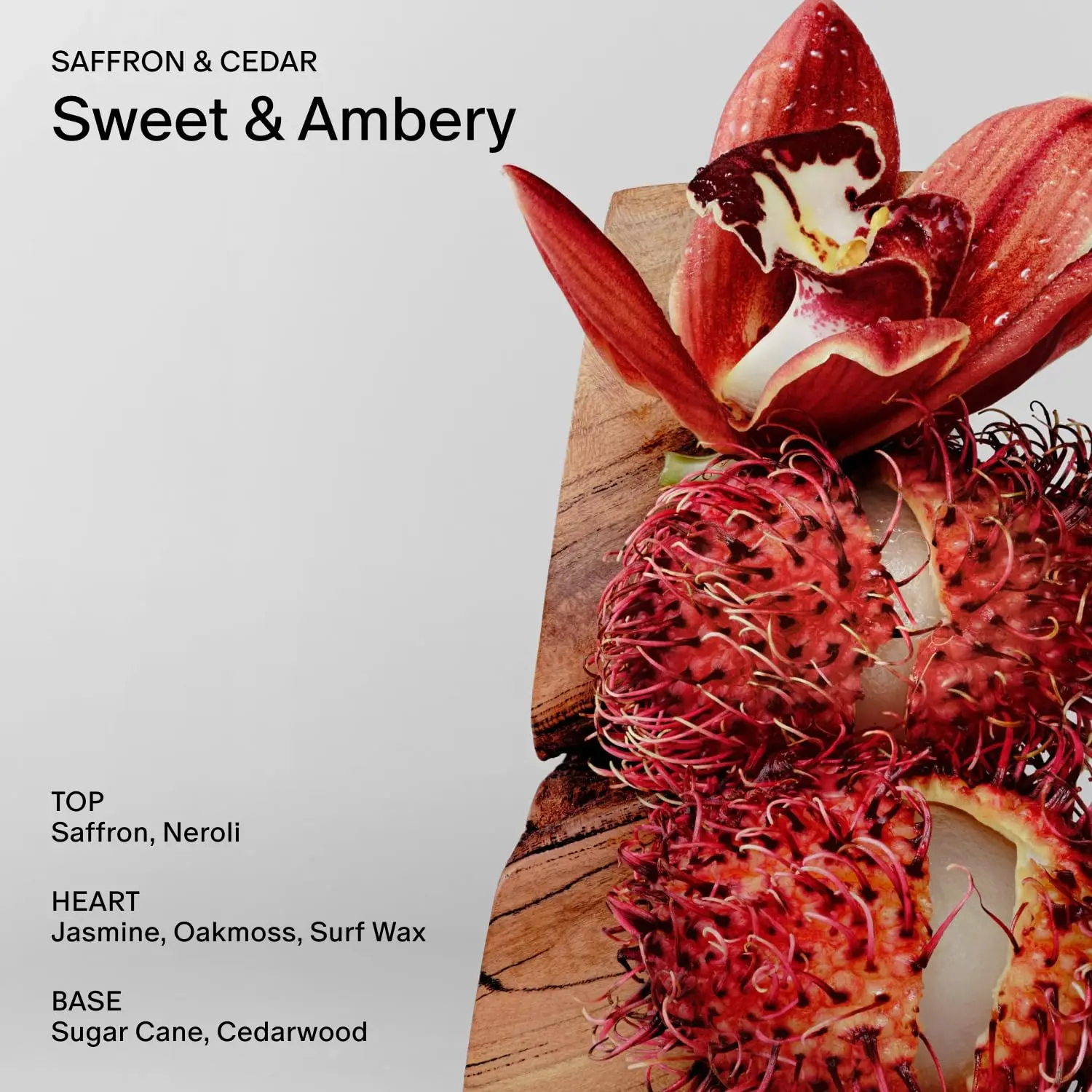 ·Iconic Scents — Saffron & Cedar is sweet, warm, and ambery—like taking a drive up the Pacific Coast where the ocean meets the mountains.