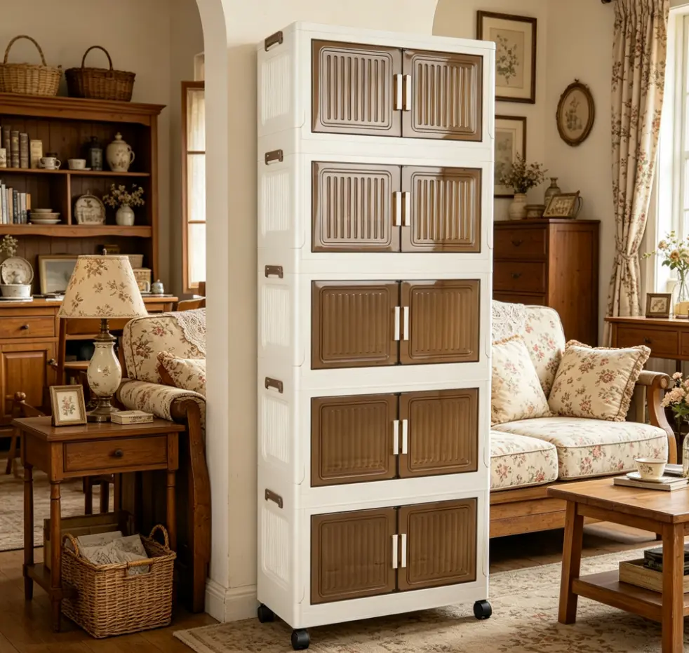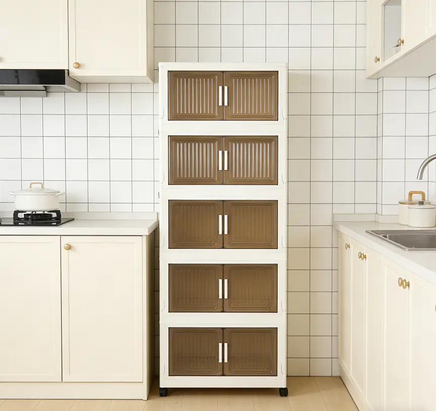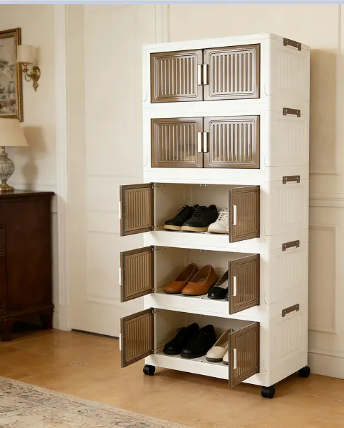 5-tier foldable, stackable plastic storage cabinet with wheels and lid—suitable for various home spaces: bedroom, living room, wardrobe/closet, bathroom, shower, kitchen, hat storage, shoe rack organizer, rack.