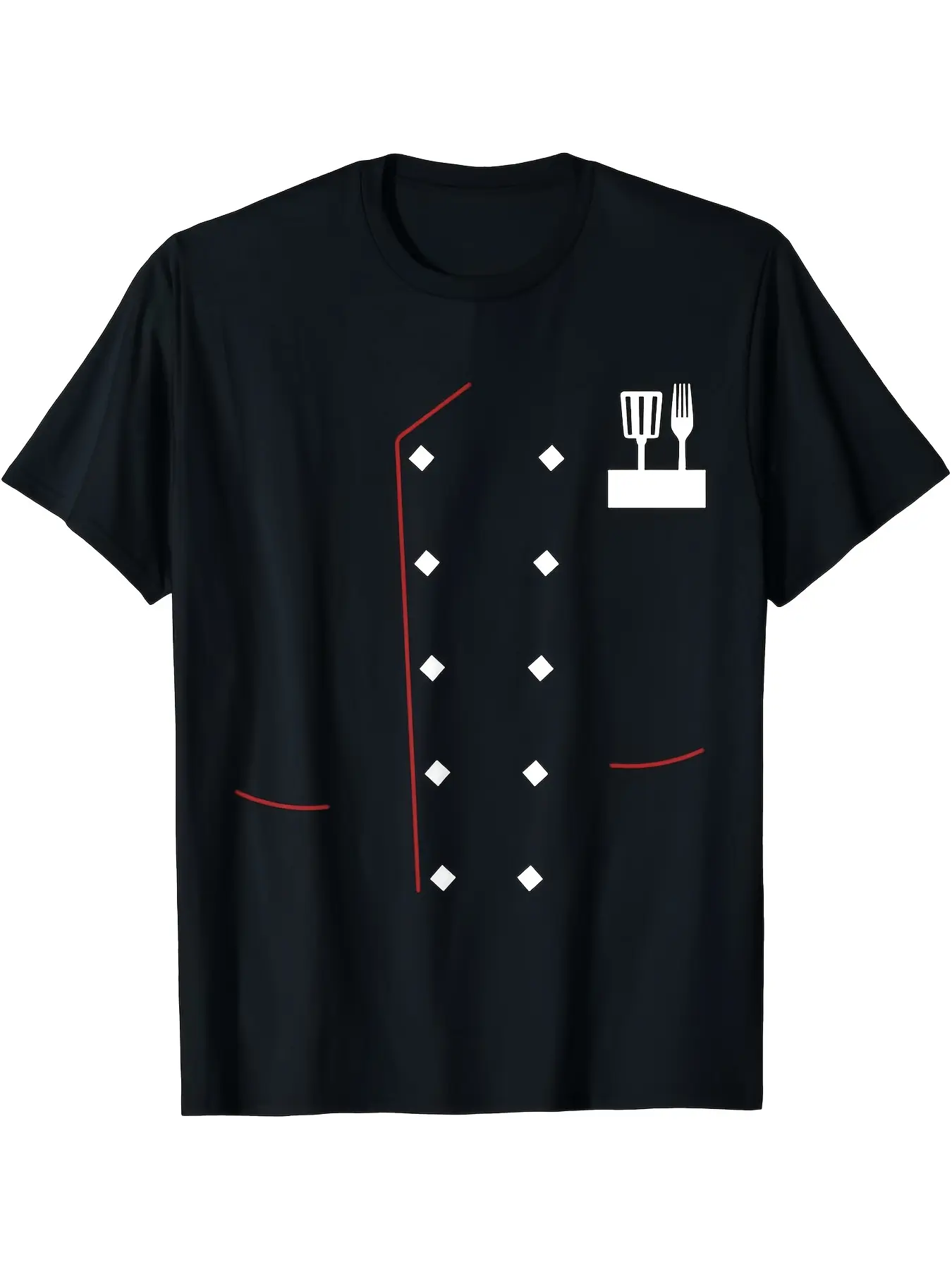Men's Chef Uniform Jacket - Black & Red Culinary Apparel with Knife & Spoon Design, Faux Chef Coat for Cooking, Comfortable Short Sleeve All-Season Shirt, Machine Washable Professional & Casual Wear for Chefs, Cooking Classes, Restaurants, Everyday & Outd