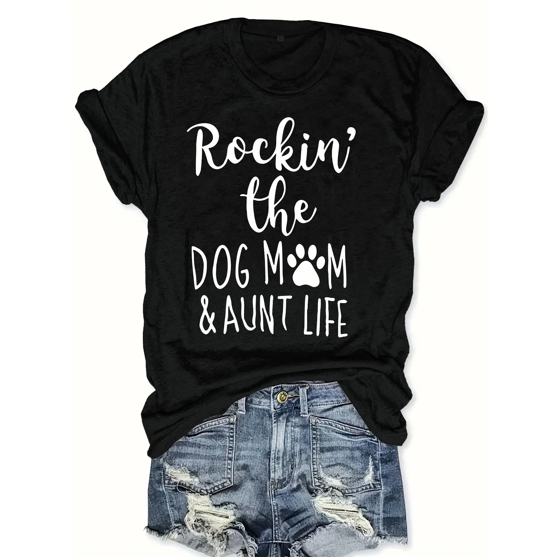 Plus Size Dog Mom & Aunt Life Print T-shirt, Casual Short Sleeve Crew Neck Top For Spring & Summer, Women's Plus Size Clothing
