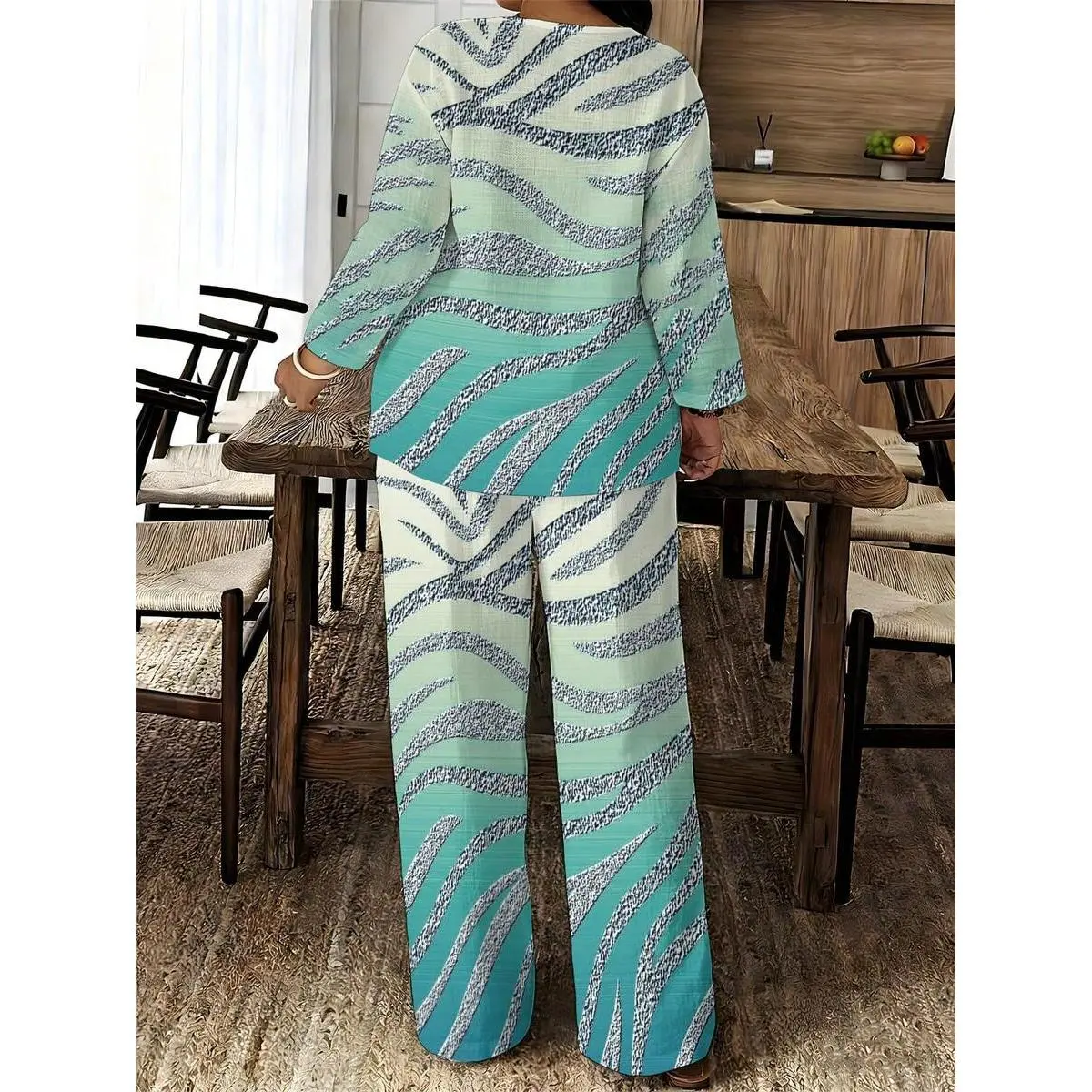 Ciel Fashion Mature Women Plus Size Notch Collar Three-Quarter Sleeve Top Wide Leg Pants Two-Piece Set Mint Green Wavy Zebra Print Loose Breathable Set Comfortable Versatile Outfit For Spring Summer Travel And Home Wear