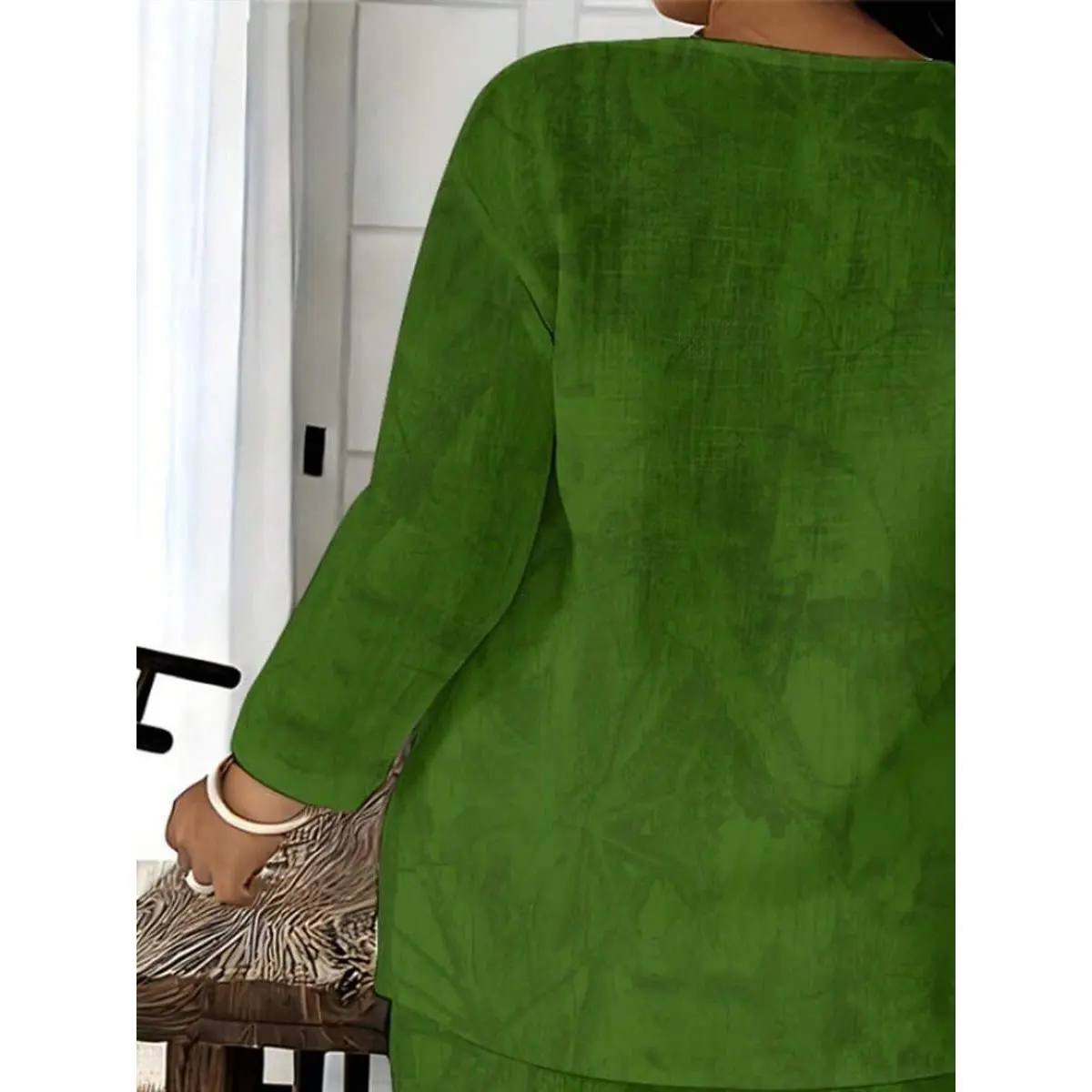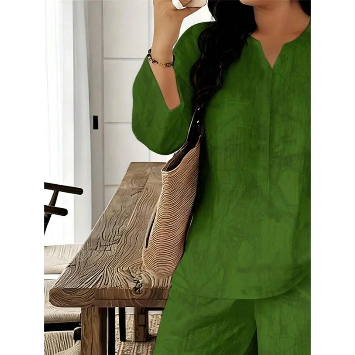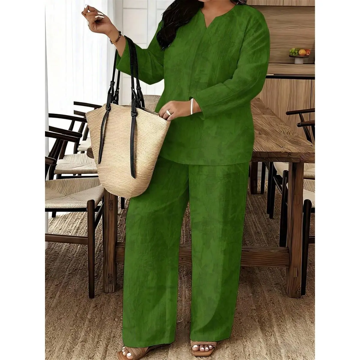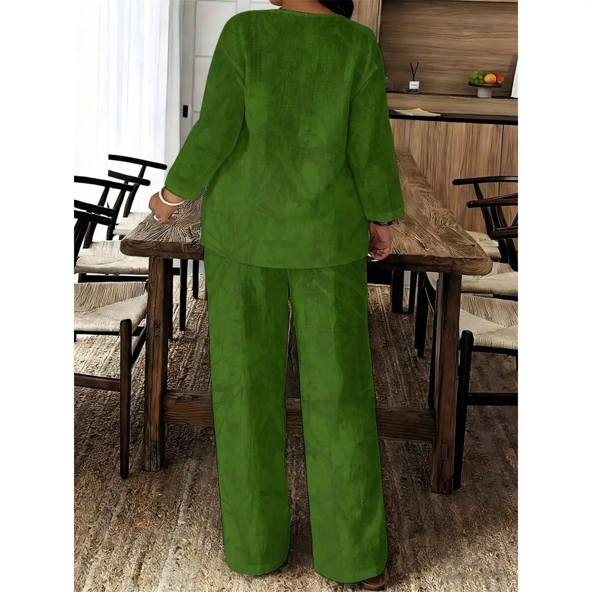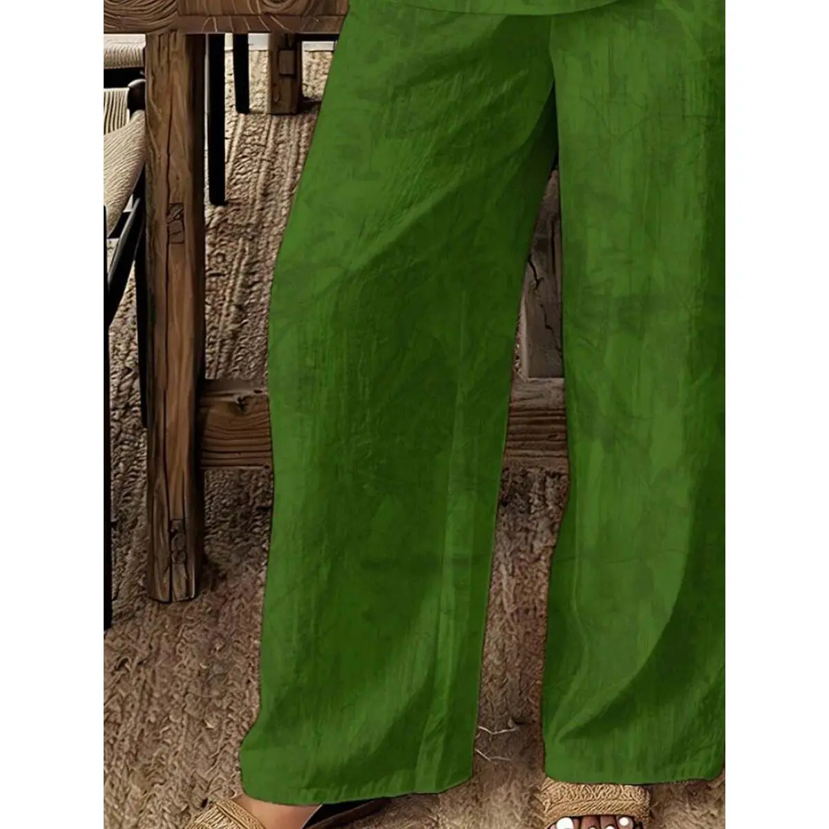 Ciel Fashion Plus Size V-Neck Half Sleeve Top & Wide Leg Pants Two-Piece Set For Mature Women, Emerald Green Solid Color Texture Print, Loose Breathable Outfit, Comfortable Versatile Wear For Spring/Summer Travel & Home