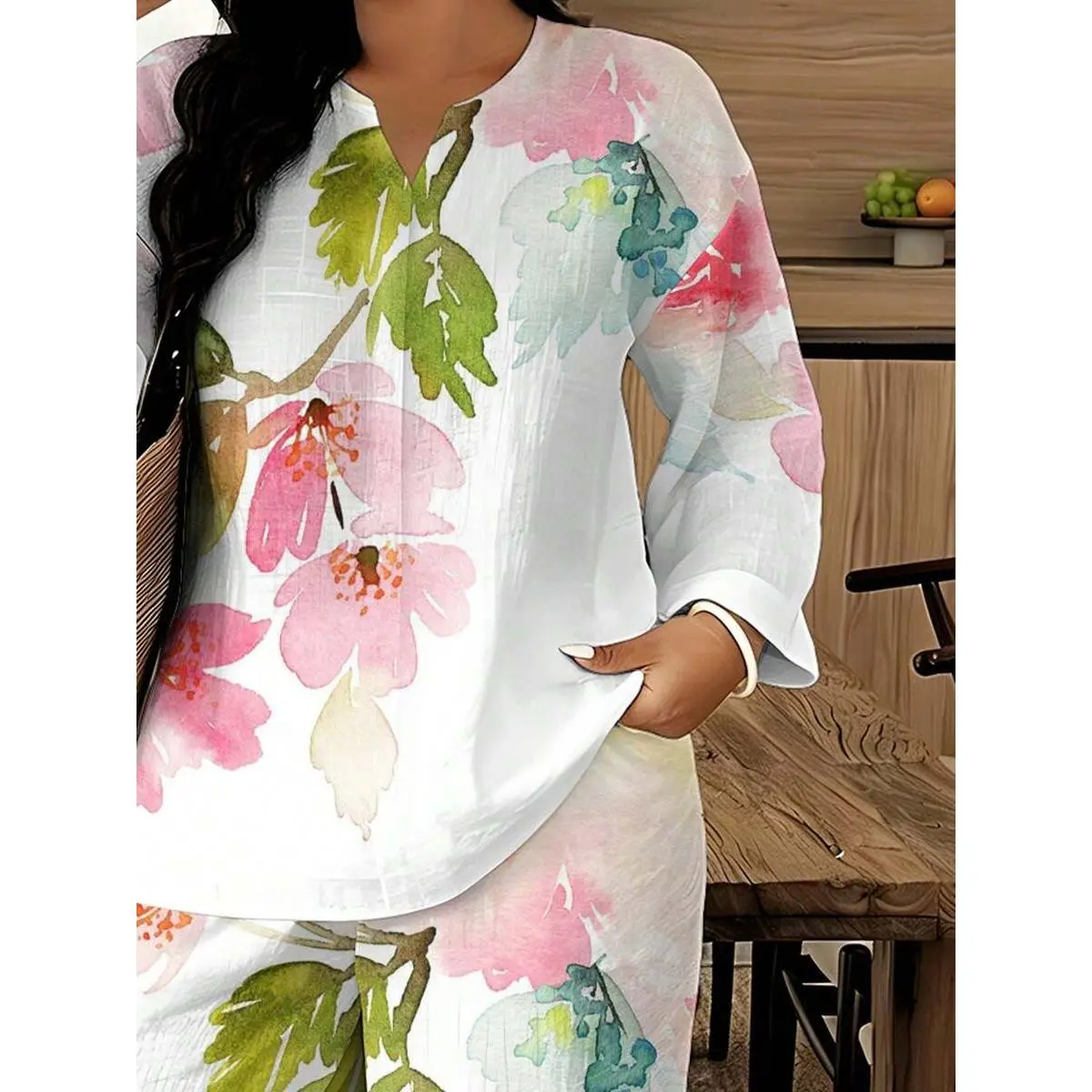 Ciel Fashion Mature Women Plus Size Notch Collar Three-Quarter Sleeve Top Wide Leg Pants Two-Piece Set Watercolor Pink Flower Print Loose Breathable Set Comfortable Versatile Outfit For Spring Summer Travel And Home Wear