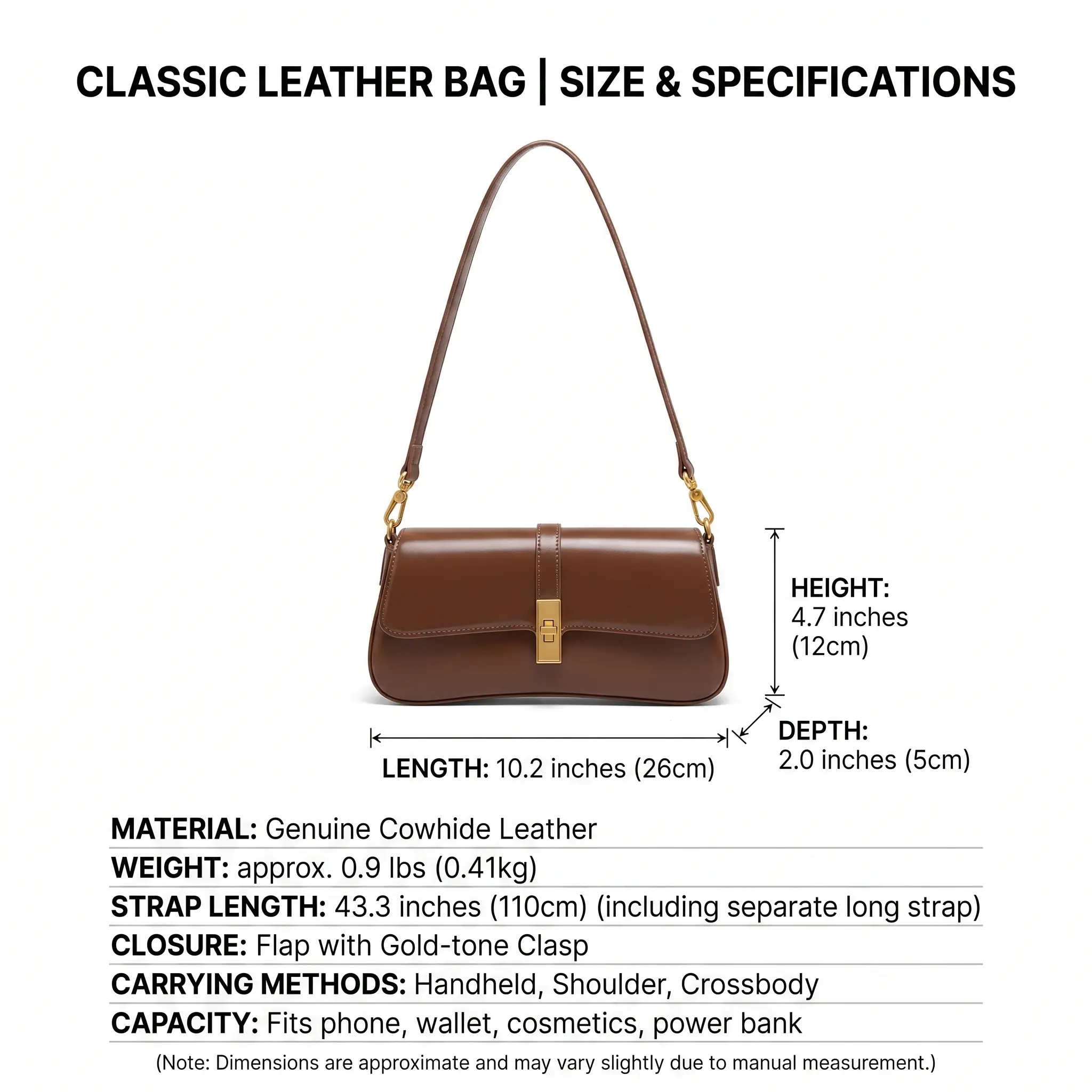 Minimalist Brown Leather Baguette Bag for Women Retro Underarm Shoulder Purse with Gold Lock